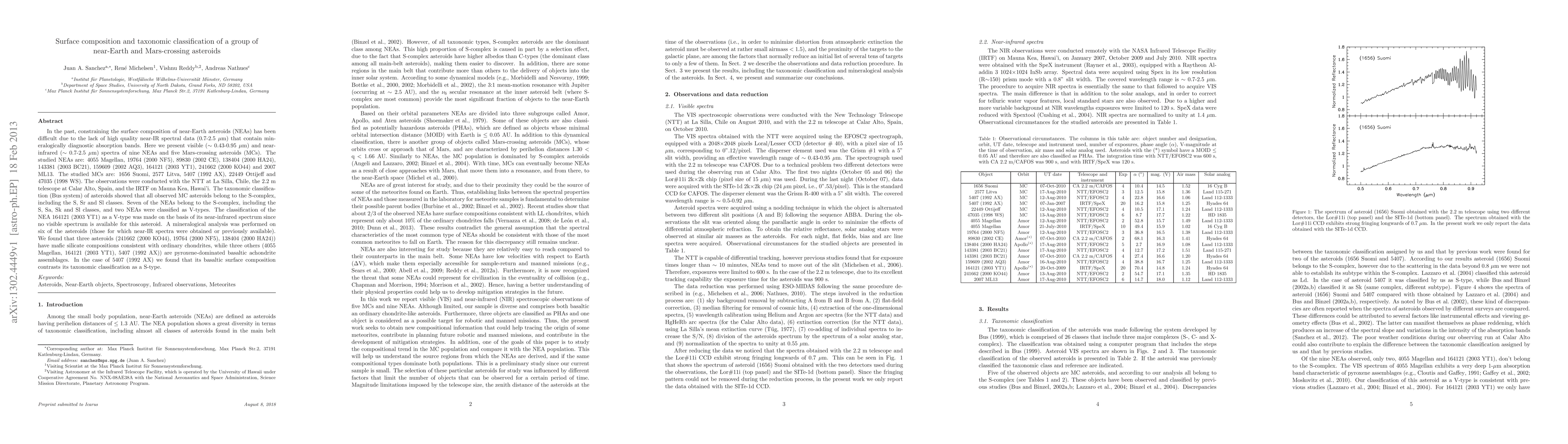 This study presents visible and near-infrared spectra of nine near-Earth asteroids and five Mars-crossing asteroids, classifying them using the Bus system and identifying their mineralogical compositions. The results show that most of the Mars-crossing asteroids are S-complex types, while near-Earth asteroids vary between S-complex and V-types, with some exhibiting pyroxene-dominated basaltic compositions.