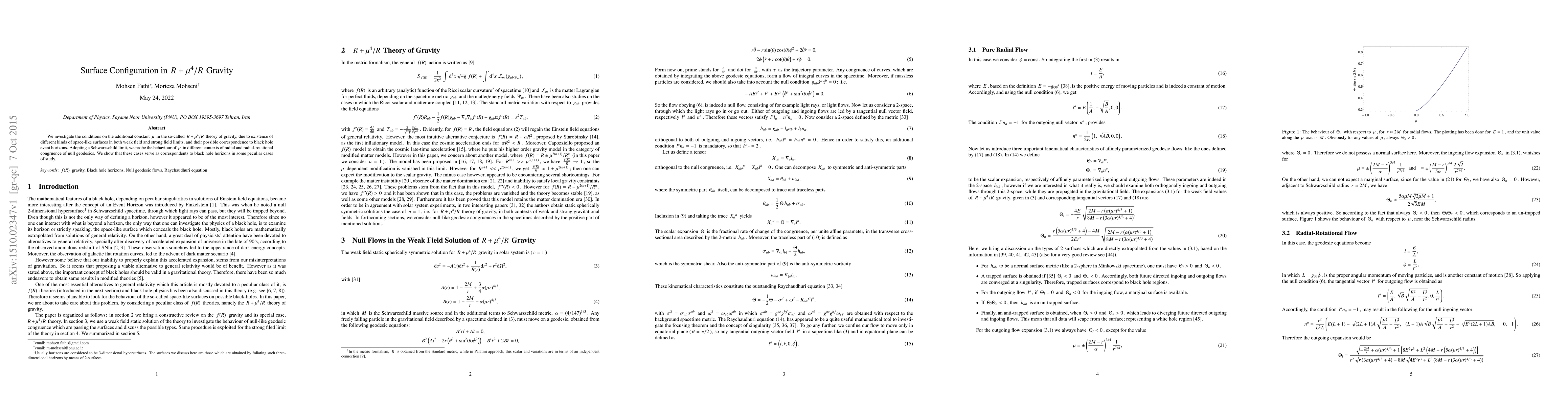 We investigate the conditions on the additional constant $\mu$ in the so-called $R+\mu^4/R$ theory of gravity, due to existence of different kinds of space-like surfaces in both weak field and strong field limits, and their possible correspondence to black hole event horizons. Adopting a Schwarzschild limit, we probe the behaviour of $\mu$ in different contexts of radial and radial-rotational congruence of null geodesics. We show that these cases serve as correspondents to black hole horizons in some peculiar cases of study.