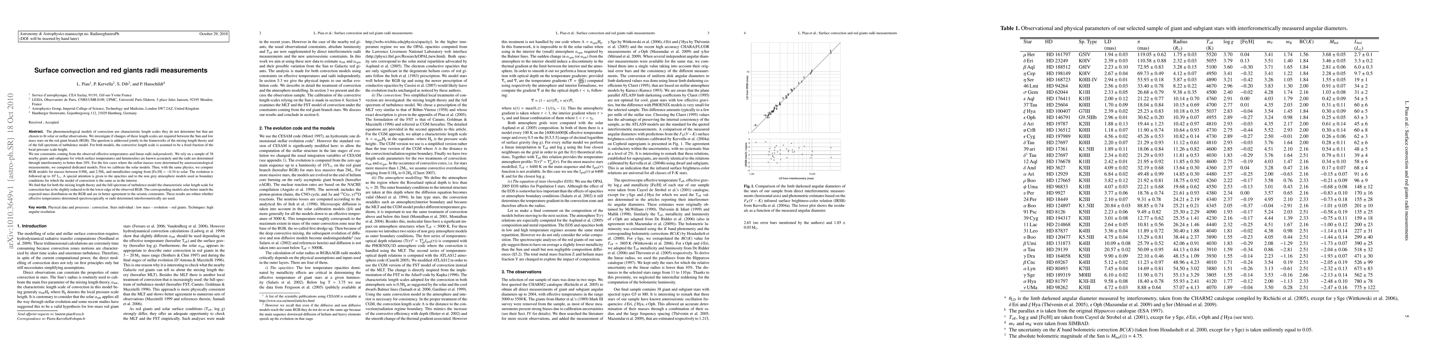 This study investigates surface convection in red giants by calibrating models using solar and stellar observations, focusing on the mixing length theory and full spectrum of turbulence model. It uses a sample of 38 nearby giants and subgiants with accurately known temperatures, luminosities, and radii measured through interferometry.