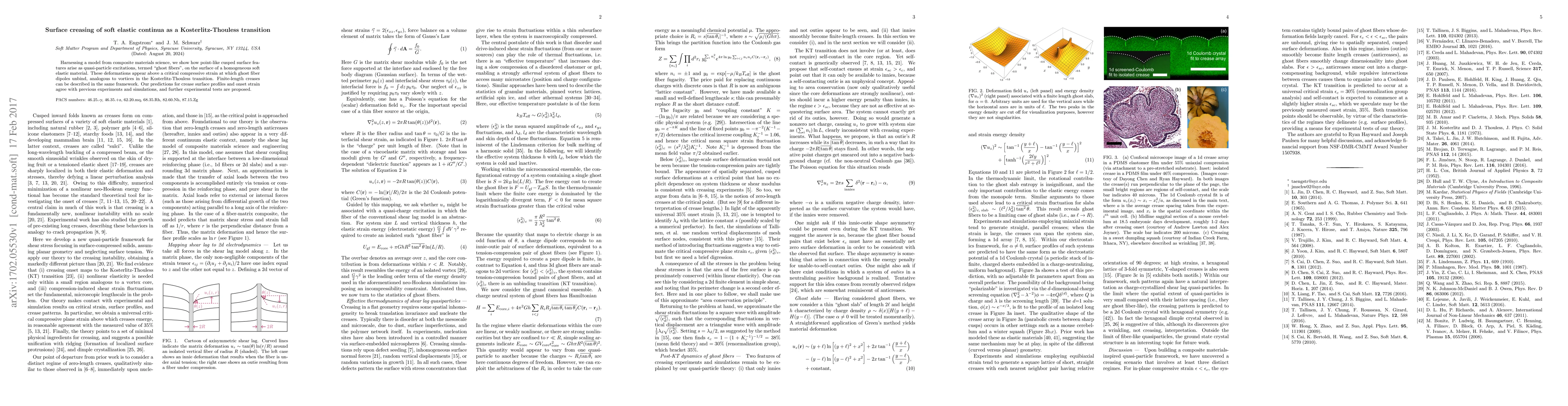 This paper demonstrates that surface creasing in soft elastic materials follows a Kosterlitz-Thouless transition, where "ghost fibers" act as quasi-particle excitations that unbind above a critical strain, leading to finite-length creases. The model aligns with experimental observations and suggests further tests to validate the findings.