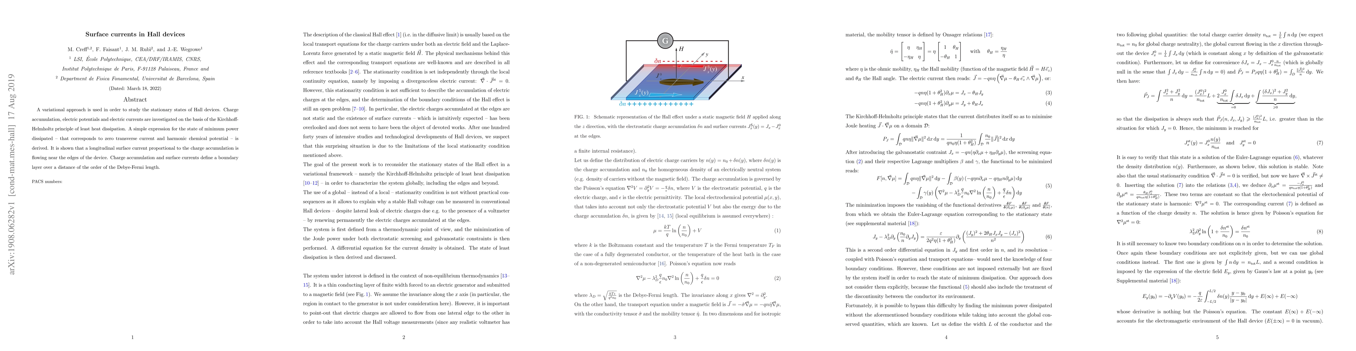 A variational approach is used in order to study the stationary states of Hall devices. Charge accumulation, electric potentials and electric currents are investigated on the basis of the Kirchhoff-Helmholtz principle of least heat dissipation. A simple expression for the state of minimum power dissipated -- that corresponds to zero transverse current and harmonic chemical potential -- is derived. It is shown that a longitudinal surface current proportional to the charge accumulation is flowing near the edges of the device. Charge accumulation and surface currents define a boundary layer over a distance of the order of the Debye-Fermi length.