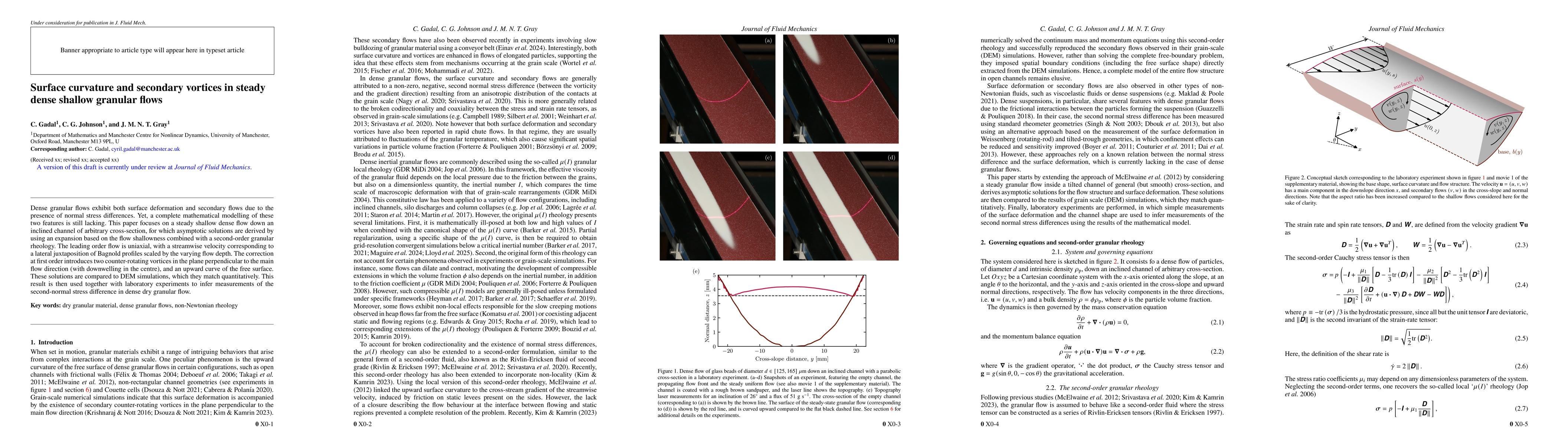 Dense granular flows exhibit both surface deformation and secondary flows due to the presence of normal stress differences. Yet, a complete mathematical modelling of these two features is still lacking. This paper focuses on a steady shallow dense flow down an inclined channel of arbitrary cross-section, for which asymptotic solutions are derived by using an expansion based on the flow shallowness combined with a second-order granular rheology. The leading order flow is uniaxial, with a streamwise velocity corresponding to a lateral juxtaposition of Bagnold profiles scaled by the varying flow depth. The correction at first order introduces two counter-rotating vortices in the plane perpendicular to the main flow direction (with downwelling in the centre), and an upward curve of the free surface. These solutions are compared to DEM simulations, which they match quantitatively. This result is then used together with laboratory experiments to infer measurements of the second-normal stress difference in dense dry granular flow.