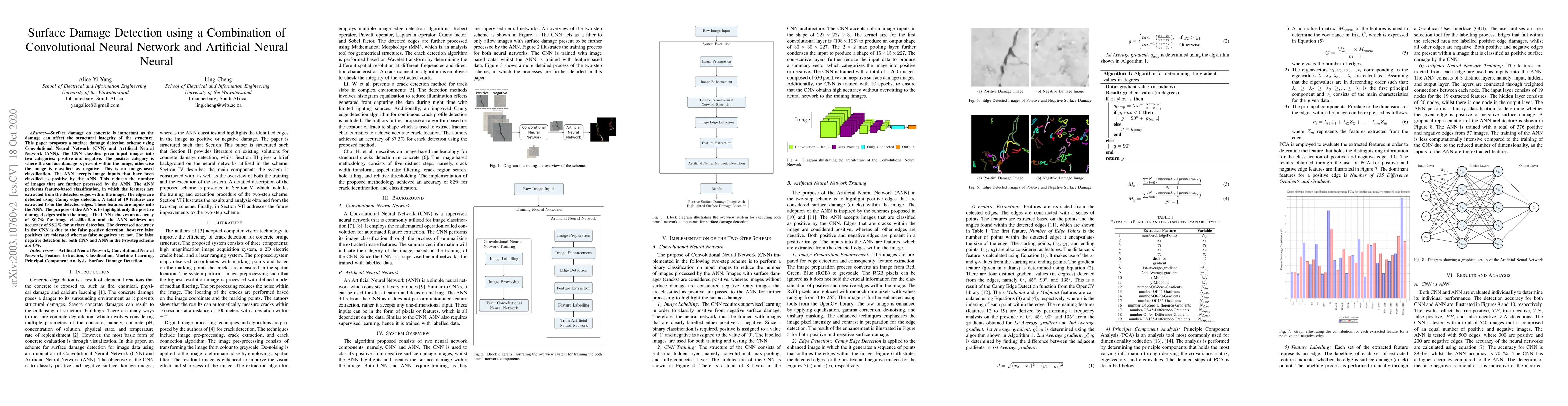 This research proposes a two-step surface damage detection scheme using Convolutional Neural Network (CNN) for image-based classification and Artificial Neural Network (ANN) for feature-based classification, employing Canny edge detection to extract features.