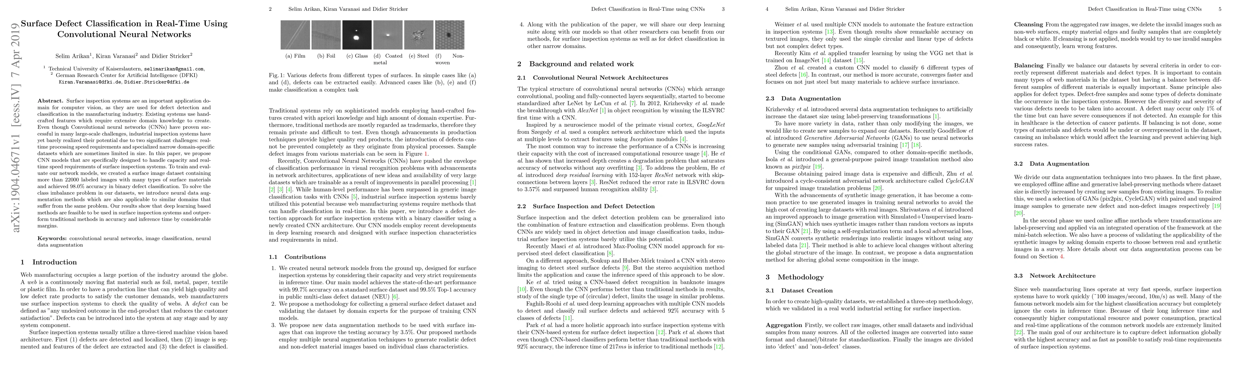 This paper proposes CNN models tailored for real-time surface defect classification in manufacturing, achieving 98.0% accuracy. It addresses the challenges of speed and dataset limitations through specialized network design and neural data augmentation, outperforming traditional methods.