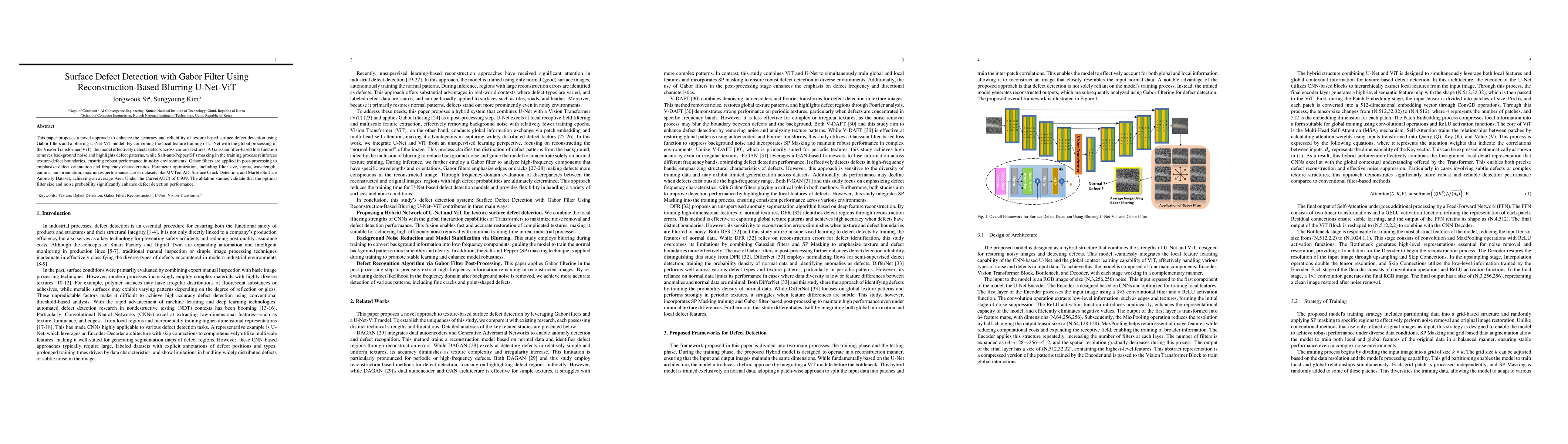 This paper proposes a novel approach to enhance the accuracy and reliability of texture-based surface defect detection using Gabor filters and a blurring U-Net-ViT model. By combining the local feature training of U-Net with the global processing of the Vision Transformer(ViT), the model effectively detects defects across various textures. A Gaussian filter-based loss function removes background noise and highlights defect patterns, while Salt-and-Pepper(SP) masking in the training process reinforces texture-defect boundaries, ensuring robust performance in noisy environments. Gabor filters are applied in post-processing to emphasize defect orientation and frequency characteristics. Parameter optimization, including filter size, sigma, wavelength, gamma, and orientation, maximizes performance across datasets like MVTec-AD, Surface Crack Detection, and Marble Surface Anomaly Dataset, achieving an average Area Under the Curve(AUC) of 0.939. The ablation studies validate that the optimal filter size and noise probability significantly enhance defect detection performance.