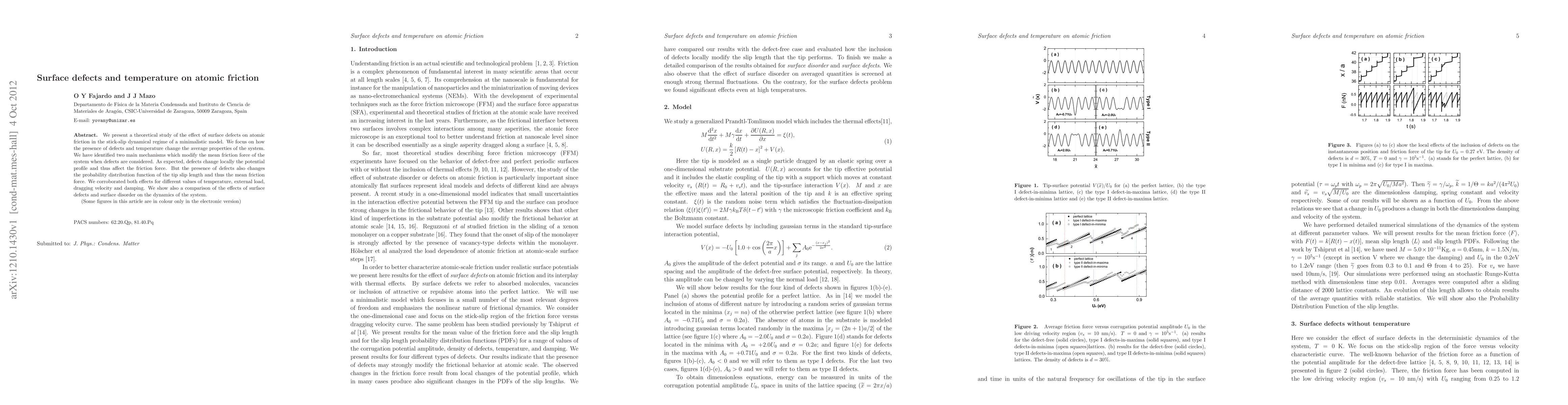 This study theoretically explores how surface defects and temperature influence atomic friction in a stick-slip regime, identifying two main mechanisms altering the mean friction force: local potential profile changes and modified tip slip length probability distribution. Results show these effects vary with temperature, load, velocity, and damping.
