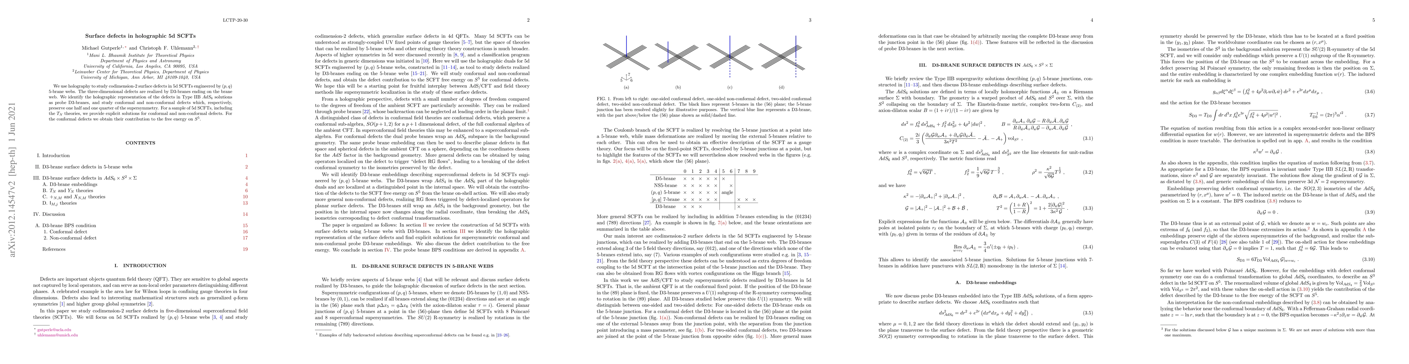 This research employs holography to investigate codimension-2 surface defects in 5d SCFTs created by $(p,q)$ 5-brane webs, identifying these defects in Type IIB $AdS_6$ as probe D3-branes and providing explicit solutions for both conformal and non-conformal defects, with the former preserving half and the latter a quarter of supersymmetry.
