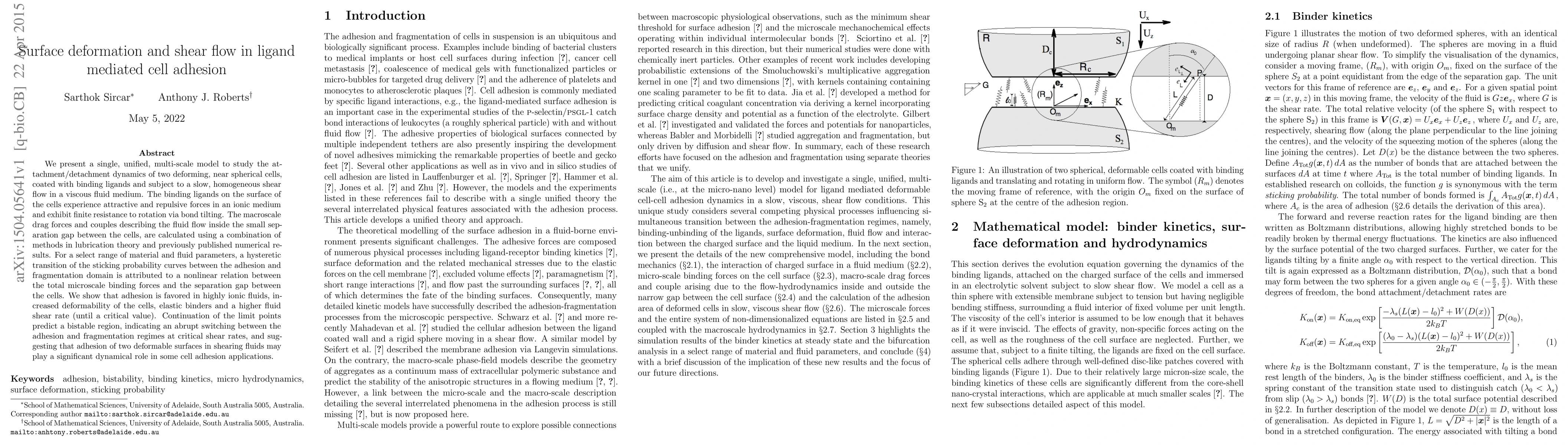 We present a single, unified, multi-scale model to study the attachment\detachment dynamics of two deforming, near spherical cells, coated with binding ligands and subject to a slow, homogeneous shear flow in a viscous fluid medium. The binding ligands on the surface of the cells experience attractive and repulsive forces in an ionic medium and exhibit finite resistance to rotation via bond tilting. The macroscale drag forces and couples describing the fluid flow inside the small separation gap between the cells, are calculated using a combination of methods in lubrication theory and previously published numerical results. For a select range of material and fluid parameters, a hysteretic transition of the sticking probability curves between the adhesion and fragmentation domain is attributed to a nonlinear relation between the total microscale binding forces and the separation gap between the cells. We show that adhesion is favored in highly ionic fluids, increased deformability of the cells, elastic binders and a higher fluid shear rate (until a critical value). Continuation of the limit points predict a bistable region, indicating an abrupt switching between the adhesion and fragmentation regimes at critical shear rates, and suggesting that adhesion of two deformable surfaces in shearing fluids may play a significant dynamical role in some cell adhesion applications.