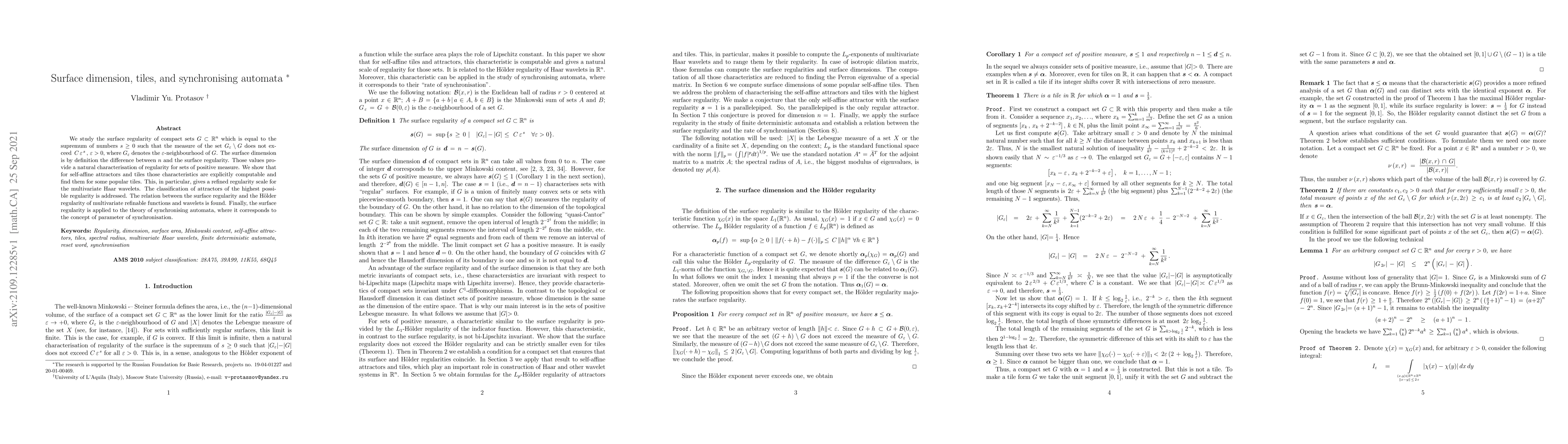 This paper investigates the surface regularity of compact sets in $R^n$ and its relation to the difference between the dimension $n$ and the surface regularity, providing a characterization for sets of positive measure. It computes these values for self-affine attractors and tiles, including a refined regularity scale for multivariate Haar wavelets, and applies the concept to synchronizing automata.