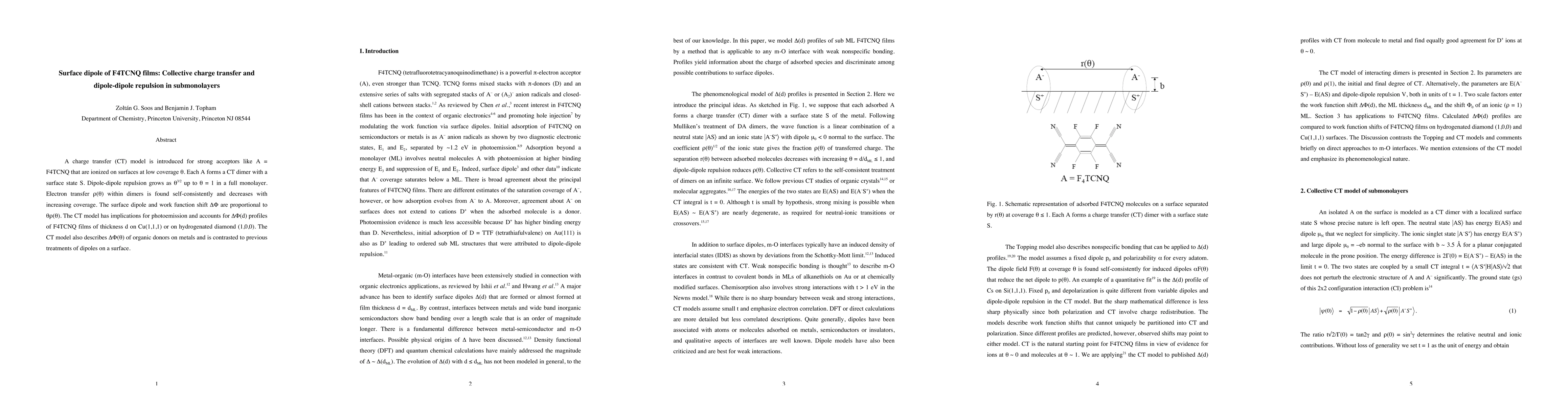 A charge transfer (CT) model is introduced for strong acceptors like A = F4TCNQ that are ionized on surfaces at low coverage {\theta}. Each A forms a CT dimer with a surface state S. Dipole-dipole repulsion grows as {\theta}^(3/2) up to {\theta} = 1 in a full monolayer. Electron transfer {\rho}({\theta}) within dimers is found self-consistently and decreases with increasing coverage. The surface dipole and work function shift {\Delta}{\Phi} are proportional to {\theta}{\rho}({\theta}). The CT model has implications for photoemission and accounts for {\Delta}{\Phi}(d) profiles of F4TCNQ films of thickness d on Cu(1,1,1) or on hydrogenated diamond (1,0,0). The CT model also describes {\Delta}{\Phi}({\theta}) of organic donors on metals and is contrasted to previous treatments of dipoles on a surface.