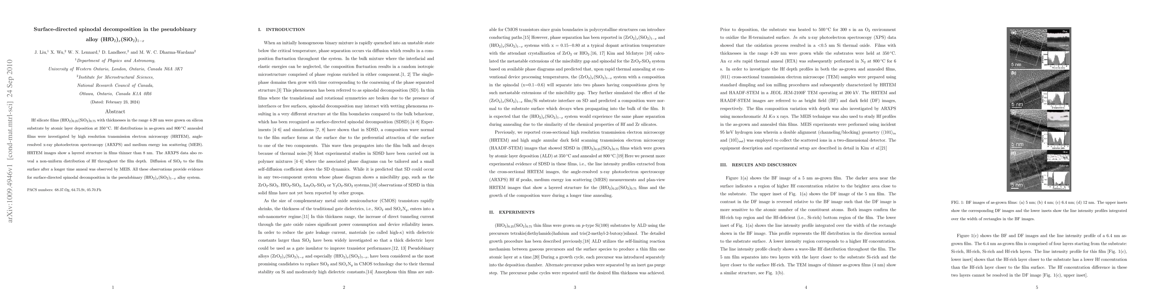 This study investigates Hf silicate films grown via atomic layer deposition, showing surface-directed spinodal decomposition through non-uniform Hf distribution and diffusion of SiO_2 to the surface, confirmed by HRTEM, ARXPS, and MEIS.