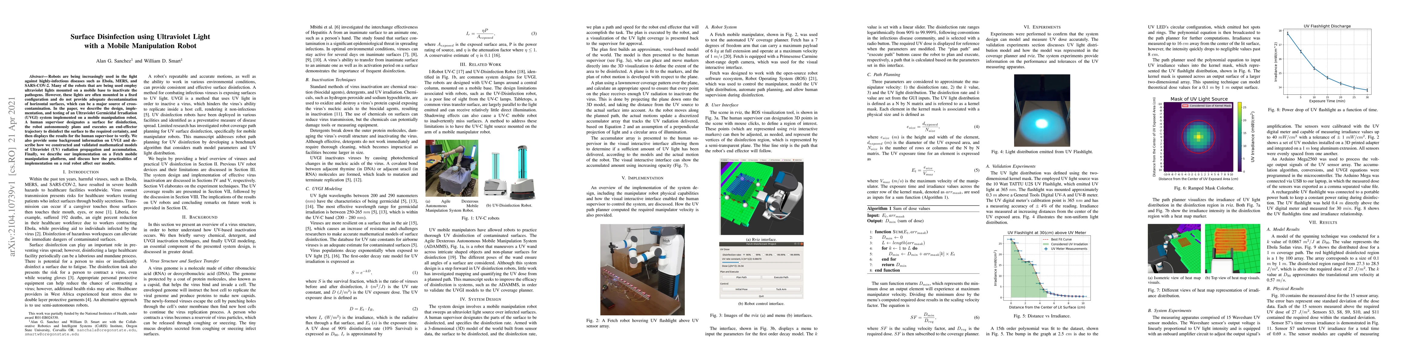 Robots are being increasingly used in the fight against highly-infectious diseases such as Ebola, MERS, and SARS-COV-2. Many of the robots that are being used employ ultraviolet lights mounted on a mobile base to inactivate the pathogens. However, these lights are often mounted in a fixed configuration and do not provide adequate decontamination of horizontal surfaces, which can be a major source of cross-contamination. In the paper, we describe the design, implementation, and testing of an Ultraviolet Germicidal Irradiation (UVGI) system implemented on a mobile manipulation robot. A human supervisor designates a surface for disinfection, the robot autonomously plans and executes an end-effector trajectory to disinfect the surface to the required certainty, and then displays the results for the human supervisor to verify. We also provide some background information on UVGI and describe how we constructed and validated mathematical models of Ultraviolet (UV) radiation propagation and accumulation. Finally, we describe our implementation on a Fetch mobile manipulation platform, and discuss how the practicalities of implementation on a real robot affect our models.