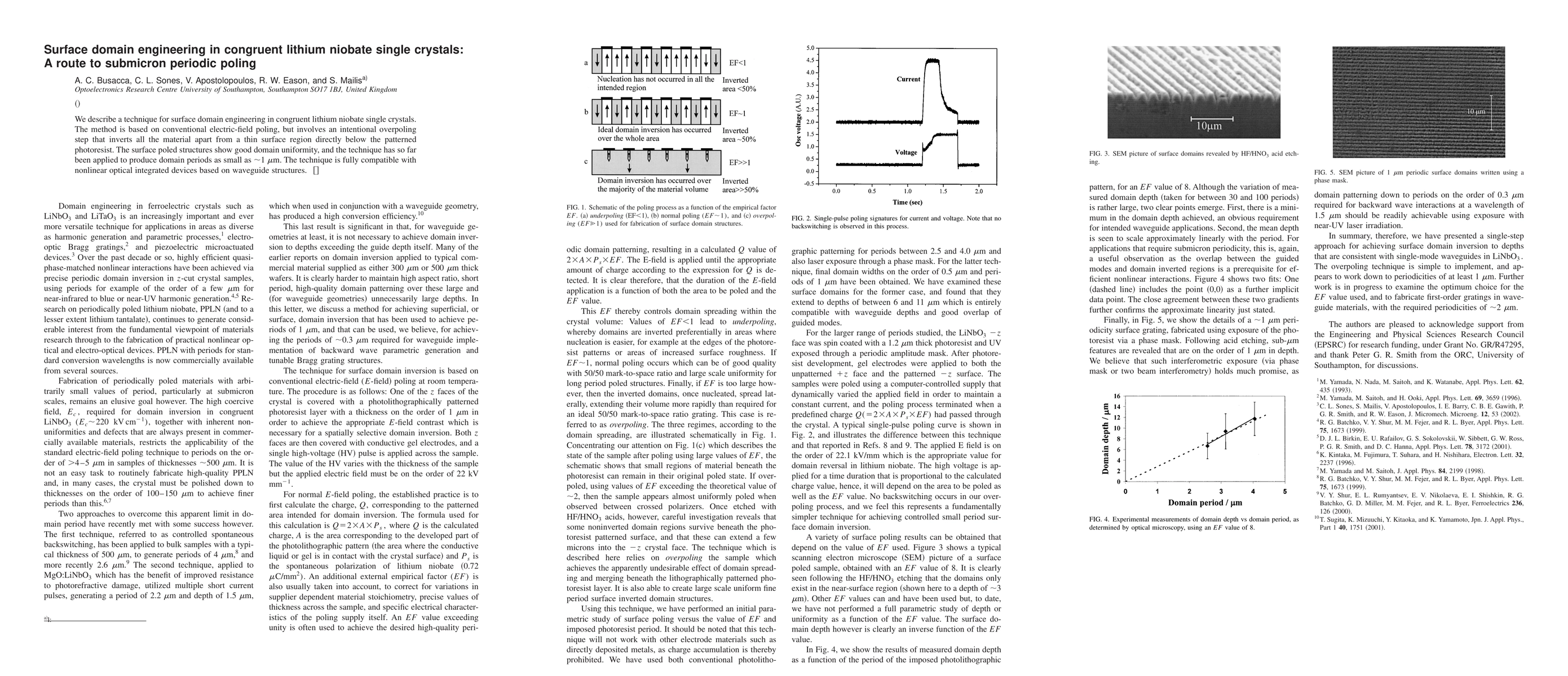 This paper presents a method for surface domain engineering in lithium niobate crystals using an overpoling technique to achieve submicron periodic poling, demonstrating domain uniformity and compatibility with nonlinear optical integrated devices. The technique has produced domain periods as small as 1 μm.