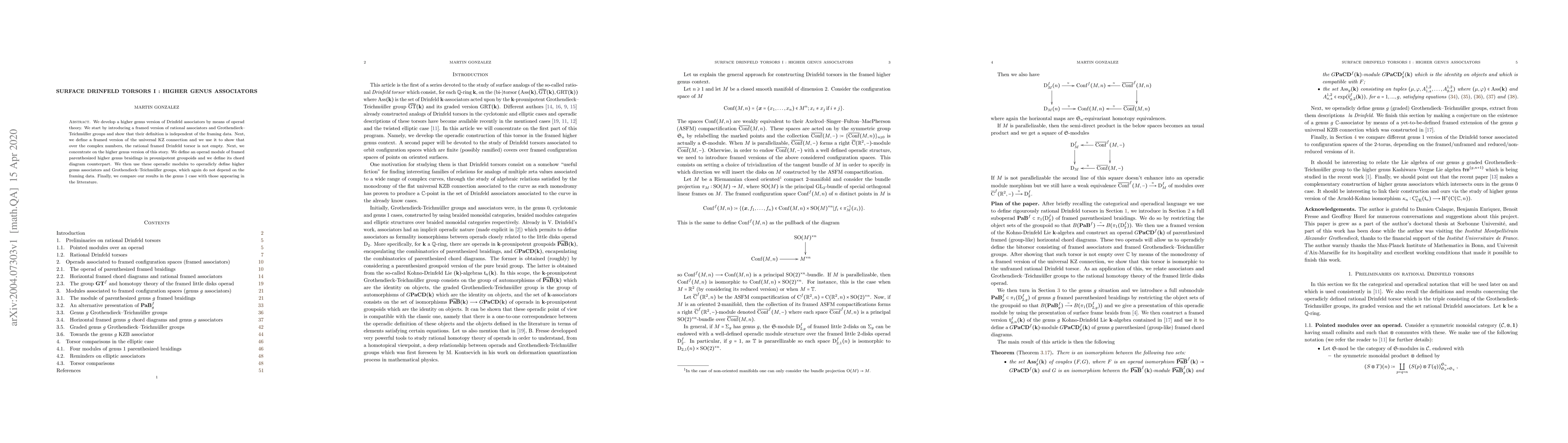 This paper develops a higher genus version of Drinfeld associators using operad theory, establishing framed rational associators and Grothendieck-Teichmüller groups independent of framing. It defines framed universal KZ connections and demonstrates the non-emptiness of rational framed Drinfeld torsors over complex numbers, then extends these concepts to higher genus through operadic modules of framed parenthesized braidings.