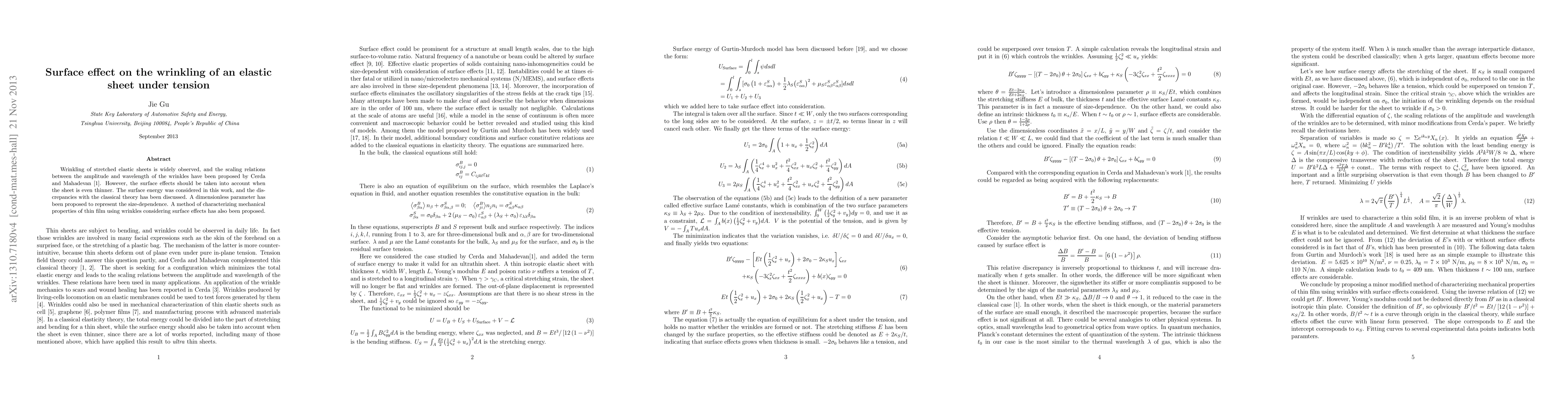 This paper explores how surface energy influences the wrinkling of thin elastic sheets under tension, proposing a dimensionless parameter to represent size-dependence and suggesting a method to characterize thin film mechanical properties via wrinkle patterns.