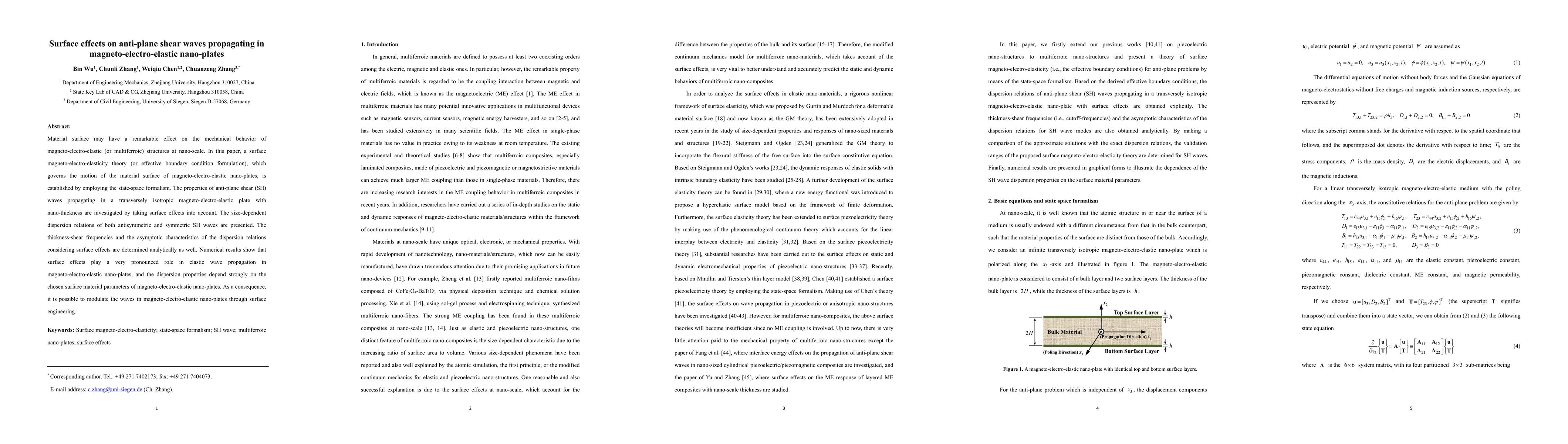 This paper establishes a surface magneto-electro-elasticity theory for nano-plates, investigating how surface effects influence the propagation of anti-plane shear waves. It reveals significant size-dependent dispersion properties and demonstrates that surface engineering can modulate wave behavior in magneto-electro-elastic nano-plates.