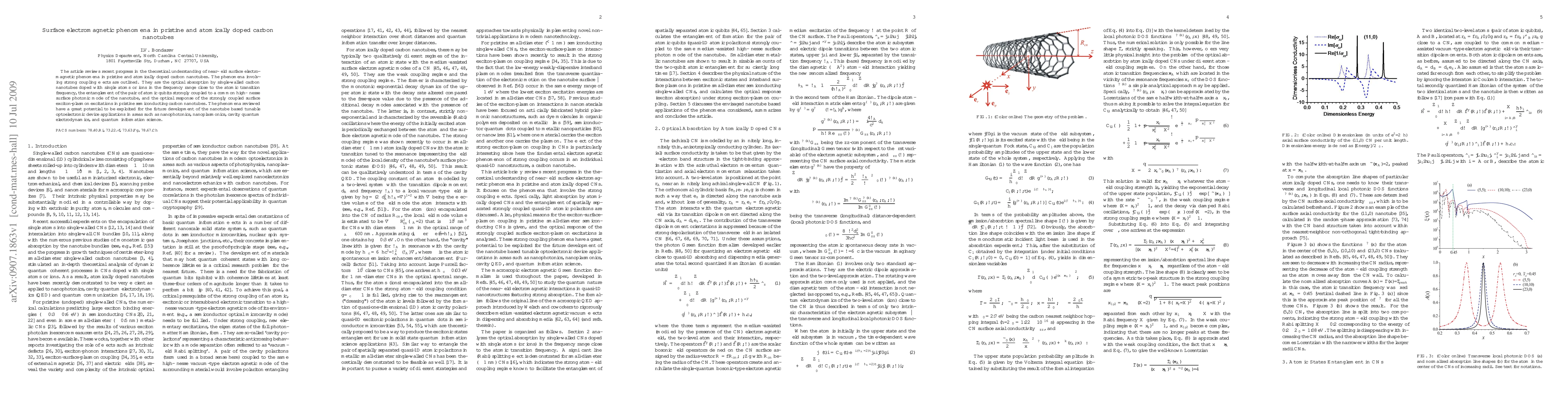 This paper reviews recent theoretical advancements regarding surface electromagnetic phenomena in both pristine and atomically doped carbon nanotubes, focusing on strong coupling effects such as optical absorption and entanglement of qubits, and their potential applications in optoelectronics and quantum information science.