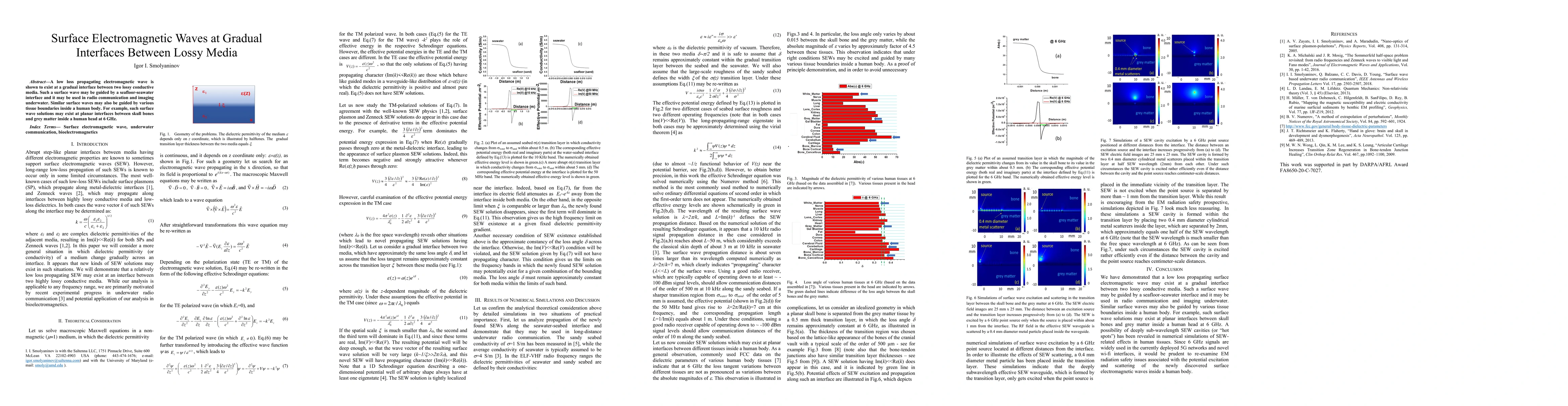 A low loss propagating electromagnetic wave is shown to exist at a gradual interface between two lossy conductive media. The electromagnetic frequency range of this phenomenon may span from UV optics to RF range. In particular, it is demonstrated that such a surface wave may be guided by a seafloor-seawater interface and it may be used in radio communication and imaging underwater. Similar surface waves may also be guided by various tissue boundaries inside a human body. For example, such surface wave solutions may exist at planar interfaces between skull bones and grey matter inside a human head at 6 GHz.