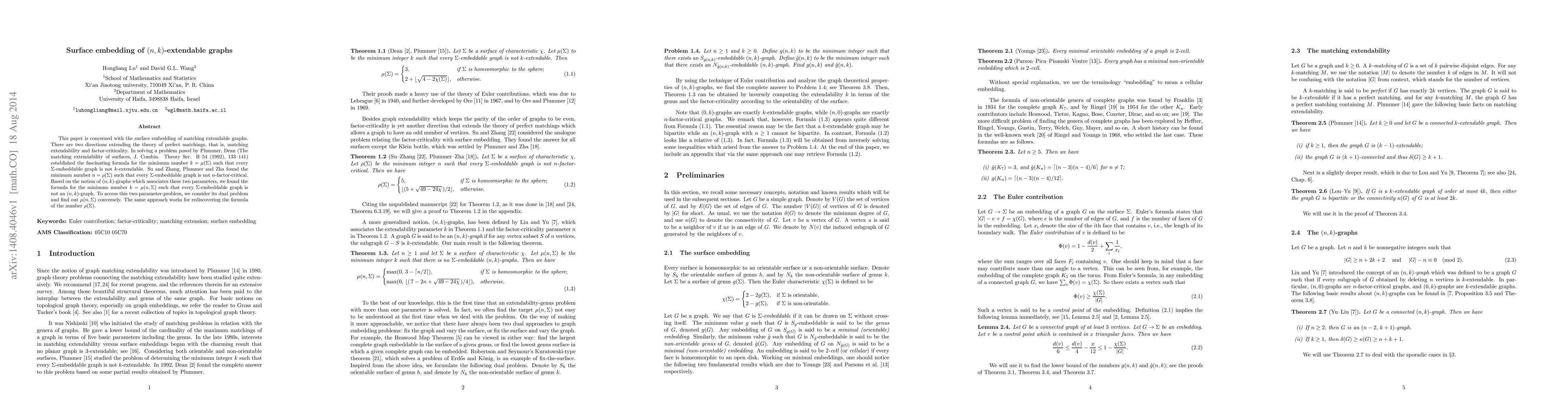 This paper investigates the surface embedding of $(n,k)$-extendable graphs, establishing a formula for the minimum number $k=\mu(n,\Sigma)$ such that every $\Sigma$-embeddable graph cannot be an $(n,k)$-graph, and similarly rediscovering the formula for the minimum number $n=\rho(\Sigma)$ for $(n,k)$-factor-critical graphs.