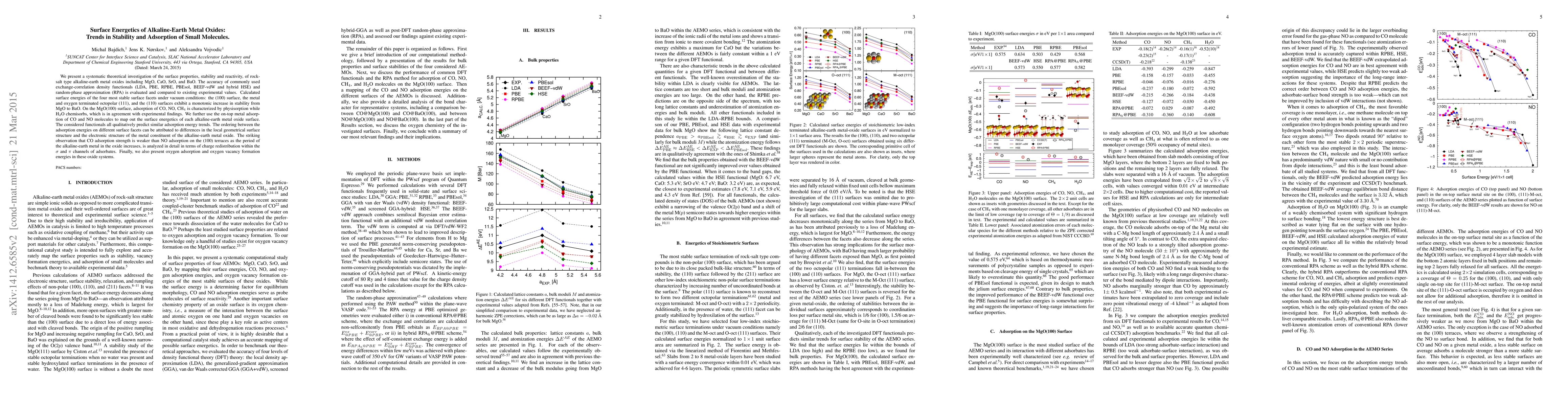 This paper systematically investigates the surface energetics, stability, and adsorption behavior of alkaline-earth metal oxides (MgO, CaO, SrO, BaO) using various density functionals. It finds a monotonic increase in stability from MgO to BaO and highlights the differences in adsorption behaviors of CO, NO, CH4, and H2O on these surfaces, attributing trends to geometrical and electronic factors.