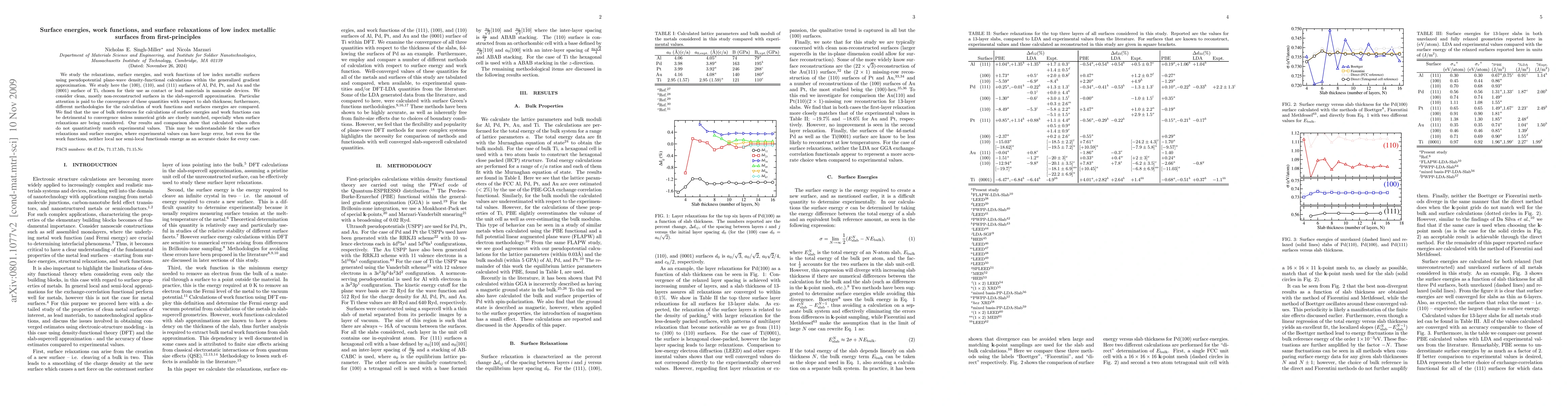 We study the relaxations, surface energies, and work functions of low index metallic surfaces using pseudopotential plane-wave density-functional calculations within the generalized gradient approximation. We study here the (100), (110), and (111) surfaces of Al, Pd, Pt, and Au and the (0001) surface of Ti, chosen for their use as contact or lead materials in nanoscale devices. We consider clean, mostly non-reconstructed surfaces in the slab-supercell approximation. Particular attention is paid to the convergence of these quantities with respect to slab thickness; furthermore, different methodologies for the calculation of work functions and surfaces energies are compared. We find that the use of bulk references for calculations of surface energies and work functions can be detrimental to convergence unless numerical grids are closely matched, especially when surface relaxations are being considered. Our results and comparison show that calculated values often do not quantitatively match experimental values. This may be understandable for the surface relaxations and surface energies, where experimental values can have large error, but even for the work functions, neither local nor semi-local functionals emerge as an accurate choice for every case.