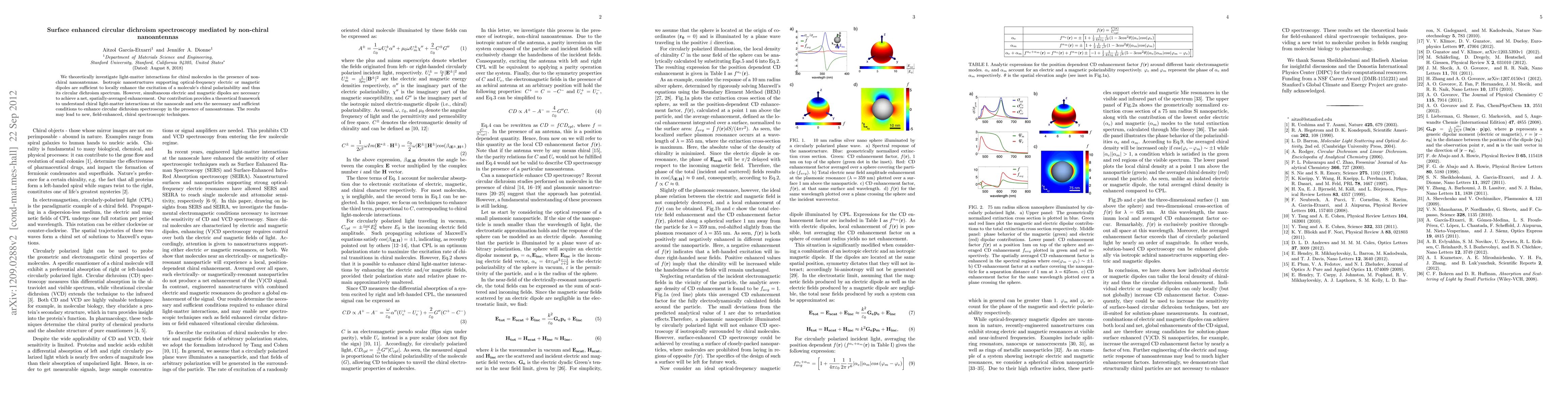 We theoretically investigate light matter interactions for chiral molecules in the presence of non-chiral nanoantennas. Isotropic nanostructures supporting optical-frequency electric or magnetic dipoles are sufficient to locally enhance the excitation of a molecule's chiral polarizability and thus its circular dichroism spectrum. However, simultaneous electric and magnetic dipoles are necessary to achieve a net, spatially-averaged enhancement. Our contribution provides a theoretical framework to understand chiral light-matter interactions at the nanoscale and sets the necessary and sufficient conditions to enhance circular dichroism spectroscopy in the presence of nanoantennas. The results may lead to new, field-enhanced, chiral spectroscopic techniques.
