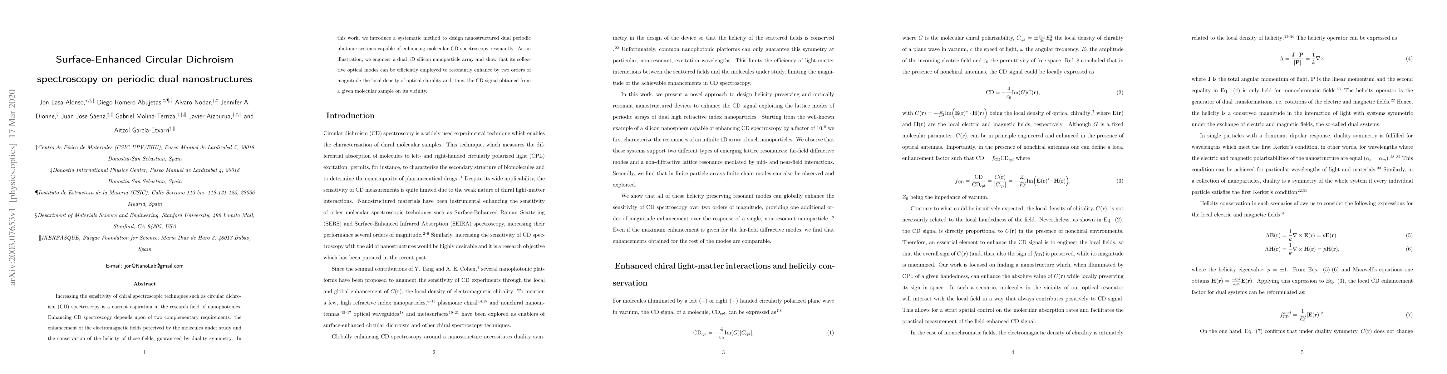 This paper presents a method for designing periodic dual nanostructures to enhance surface-enhanced circular dichroism (CD) spectroscopy, achieving a two-order-of-magnitude increase in local density of optical chirality and CD signal through resonant electromagnetic field enhancement. The study specifically demonstrates this with a dual 1D silicon nanoparticle array.