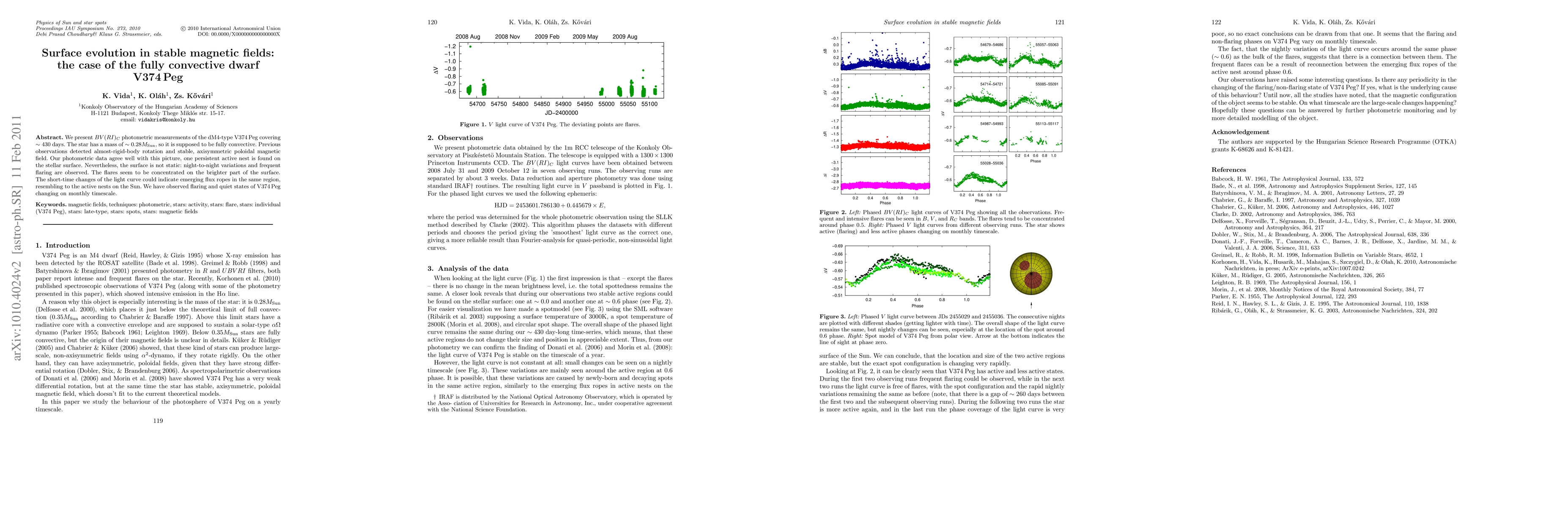 This paper reports on BV(RI)_C photometric measurements of the fully convective dM4-type star V374 Peg, revealing persistent active regions and night-to-night variations despite a stable magnetic field. The observed flares suggest emerging flux ropes, similar to the Sun's active nests.