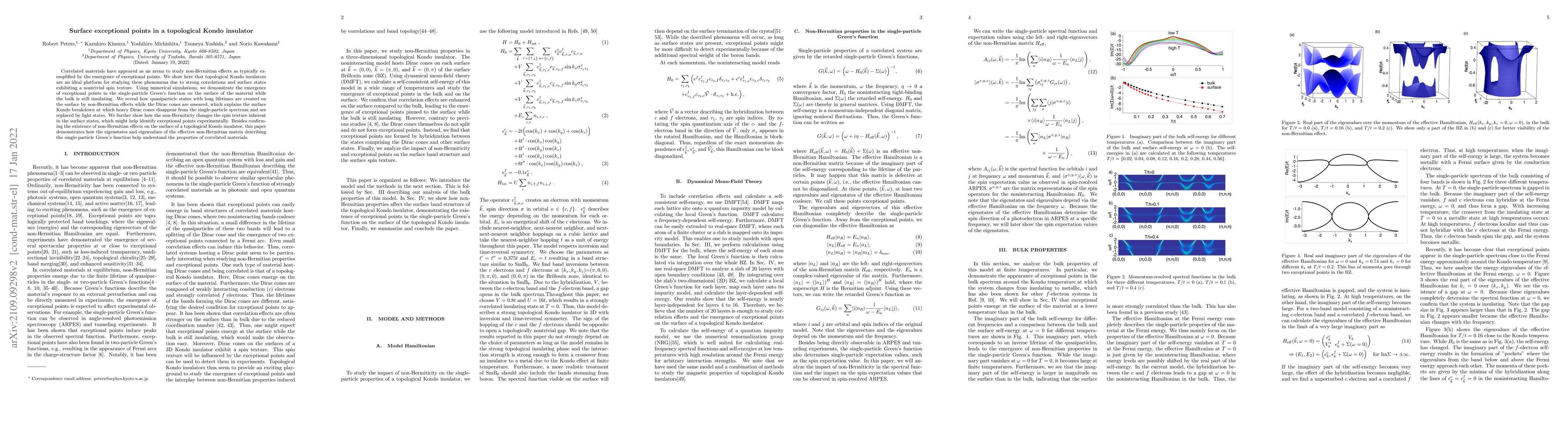 This paper explores the emergence of exceptional points in topological Kondo insulators, revealing how non-Hermitian effects create quasiparticle states on the surface while the bulk remains insulating. The study uses numerical simulations to show how these effects alter the spin texture and lead to the breakdown of surface Kondo states.