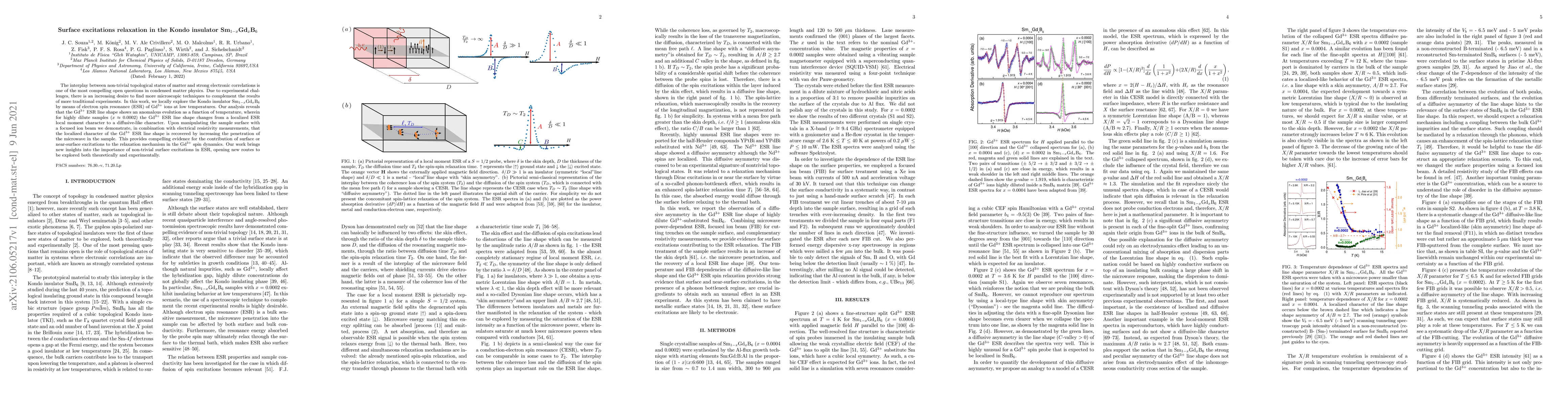 The interplay between non-trivial topological states of matter and strong electronic correlations is one of the most compelling open questions in condensed matter physics. Due to experimental challenges, there is an increasing desire to find more microscopic techniques to complement the results of more traditional experiments. In this work, we locally explore the Kondo insulator Sm$_{1-x}$Gd$_{x}$B$_{6}$ by means of electron spin resonance (ESR) of Gd$^{3+}$ ions at low temperatures. Our analysis reveals that the Gd$^{3+}$ ESR line shape shows an anomalous evolution as a function of temperature, wherein for highly dilute samples (x $\approx$ 0.0002) the Gd$^{3+}$ ESR line shape changes from a localized ESR local moment character to a diffusive-like character. Upon manipulating the sample surface with a focused ion beam we demonstrate, in combination with electrical resistivity measurements, that the localized character of the Gd$^{3+}$ ESR line shape is recovered by increasing the penetration of the microwave in the sample. This provides compelling evidence for the contribution of surface or near-surface excitations to the relaxation mechanism in the Gd$^{3+}$ spin dynamics. Our work brings new insights into the importance of non-trivial surface excitations in ESR, opening new routes to be explored both theoretically and experimentally.