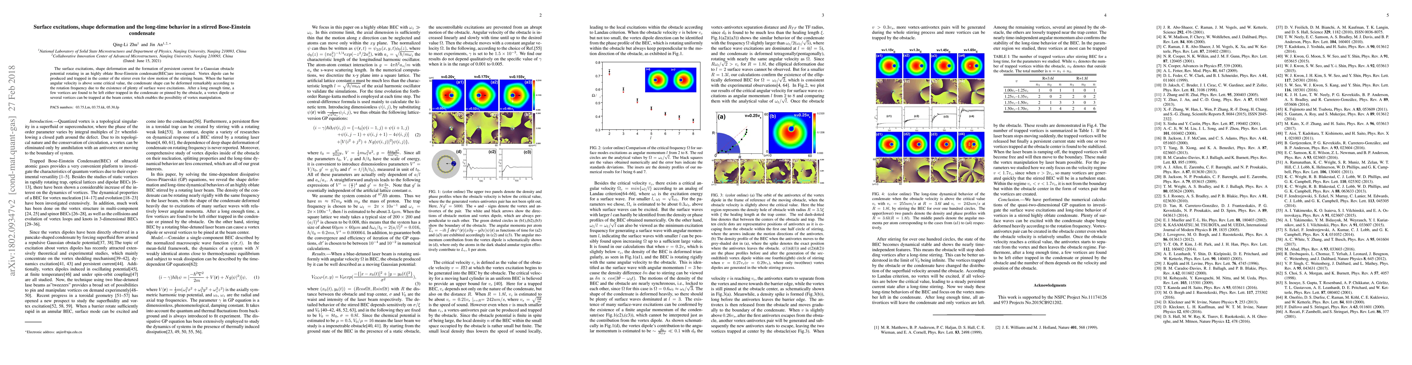This paper investigates the dynamics of surface excitations, shape deformation, and persistent currents in a highly oblate Bose-Einstein condensate (BEC) stirred by a rotating Gaussian obstacle. Vortex dipoles can form and be trapped even at slow stirring speeds, and above a critical angular velocity, the condensate shape significantly deforms due to surface wave excitations, leading to vortex trapping and manipulation possibilities.