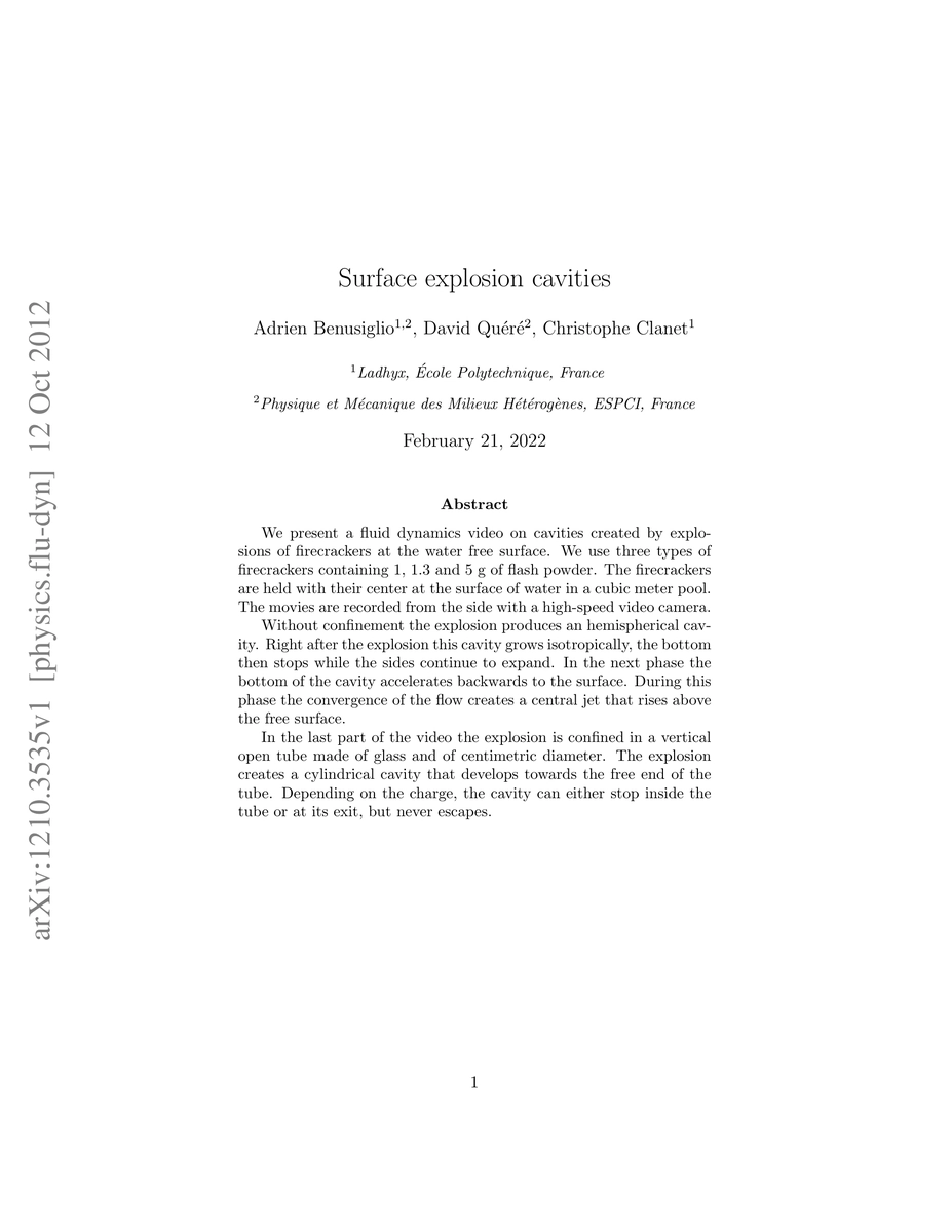 We present a fluid dynamics video on cavities created by explosions of firecrackers at the water free surface. We use three types of firecrackers containing 1, 1.3 and 5 g of flash powder. The firecrackers are held with their center at the surface of water in a cubic meter pool. The movies are recorded from the side with a high-speed video camera. Without confinement the explosion produces an hemispherical cavity. Right after the explosion this cavity grows isotropically, the bottom then stops while the sides continue to expand. In the next phase the bottom of the cavity accelerates backwards to the surface. During this phase the convergence of the flow creates a central jet that rises above the free surface. In the last part of the video the explosion is confined in a vertical open tube made of glass and of centimetric diameter. The explosion creates a cylindrical cavity that develops towards the free end of the tube. Depending on the charge, the cavity can either stop inside the tube or at its exit, but never escapes.