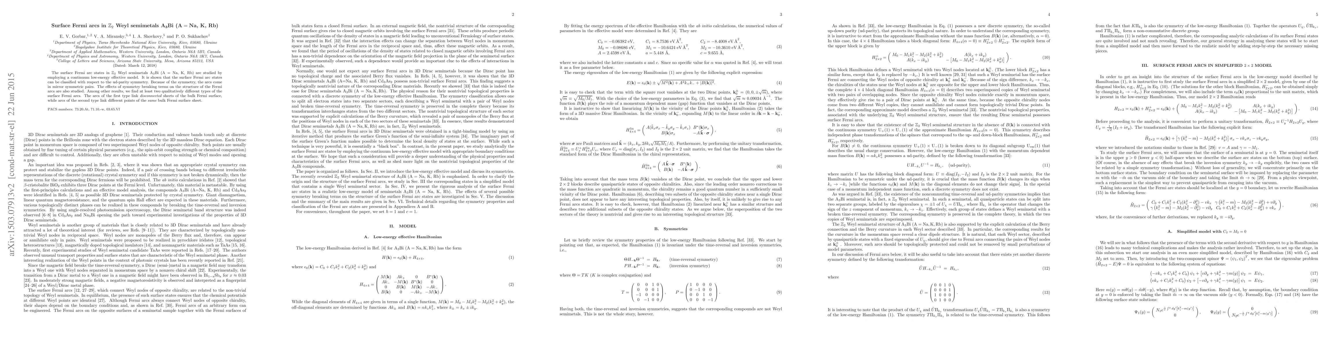 This paper investigates the surface Fermi arcs in $Z_2$ Weyl semimetals $A_3 Bi$ (A=Na, K, Rb) using a low-energy effective model, revealing that the arcs occur in mirror symmetric pairs due to ud-parity symmetry. It also explores the impact of symmetry breaking terms, identifying two distinct types of Fermi arcs: one linking disconnected bulk sheets and the other connecting different points within the same bulk sheet.