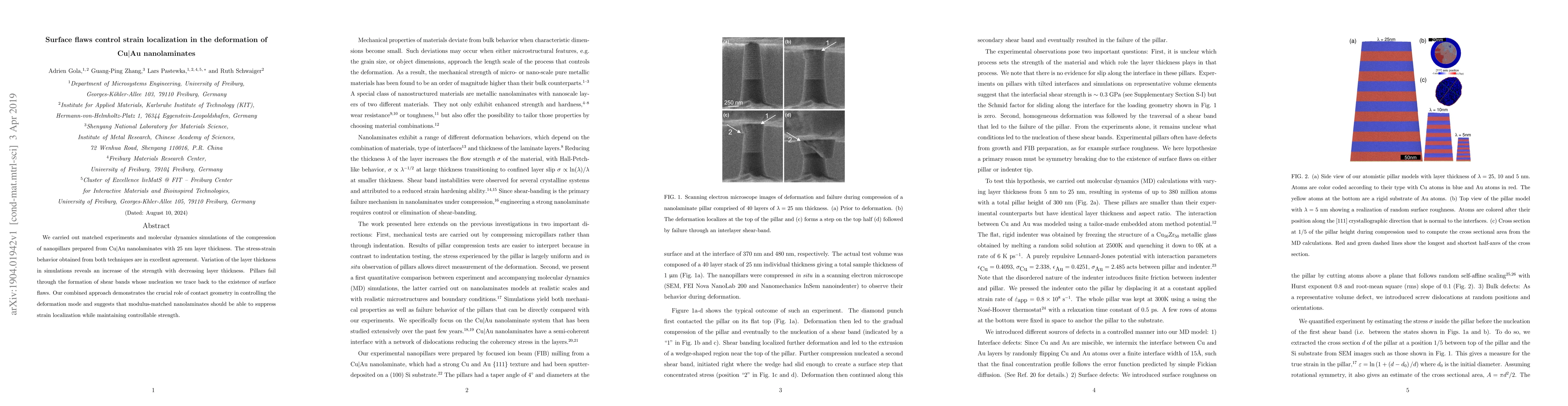 We carried out matched experiments and molecular dynamics simulations of the compression of nanopillars prepared from Cu$\vert$Au nanolaminates with 25 nm layer thickness. The stress-strain behavior obtained from both techniques are in excellent agreement. Variation of the layer thickness in simulations reveals an increase of the strength with decreasing layer thickness. Pillars fail through the formation of shear bands whose nucleation we trace back to the existence of surface flaws. Our combined approach demonstrates the crucial role of contact geometry in controlling the deformation mode and suggests that modulus-matched nanolaminates should be able to suppress strain localization while maintaining controllable strength.