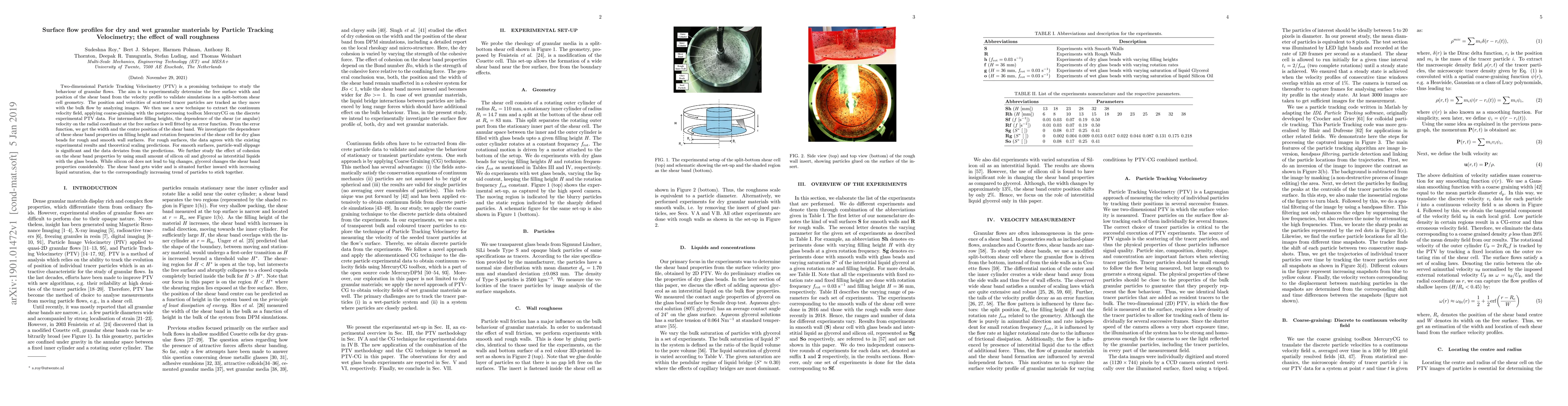 Two-dimensional Particle Tracking Velocimetry (PTV) is a promising technique to study the behaviour of granular flows. The aim is to experimentally determine the free surface width and position of the shear band from the velocity profile to validate simulations in a split-bottom shear cell geometry. The position and velocities of scattered tracer particles are tracked as they move with the bulk flow by analyzing images. We then use a new technique to extract the continuum velocity field, applying coarse-graining with the postprocessing toolbox MercuryCG on the discrete experimental PTV data. For intermediate filling heights, the dependence of the shear (or angular) velocity on the radial coordinate at the free surface is well fitted by an error function. From the error function, we get the width and the centre position of the shear band. We investigate the dependence of these shear band properties on filling height and rotation frequencies of the shear cell for dry glass beads for rough and smooth wall surfaces. For rough surfaces, the data agrees with the existing experimental results and theoretical scaling predictions. For smooth surfaces, particle-wall slippage is significant and the data deviates from the predictions. We further study the effect of cohesion on the shear band properties by using small amount of silicon oil and glycerol as interstitial liquids with the glass beads. While silicon oil does not lead to big changes, glycerol changes the shear band properties considerably. The shear band gets wider and is situated further inward with increasing liquid saturation, due to the correspondingly increasing trend of particles to stick together.