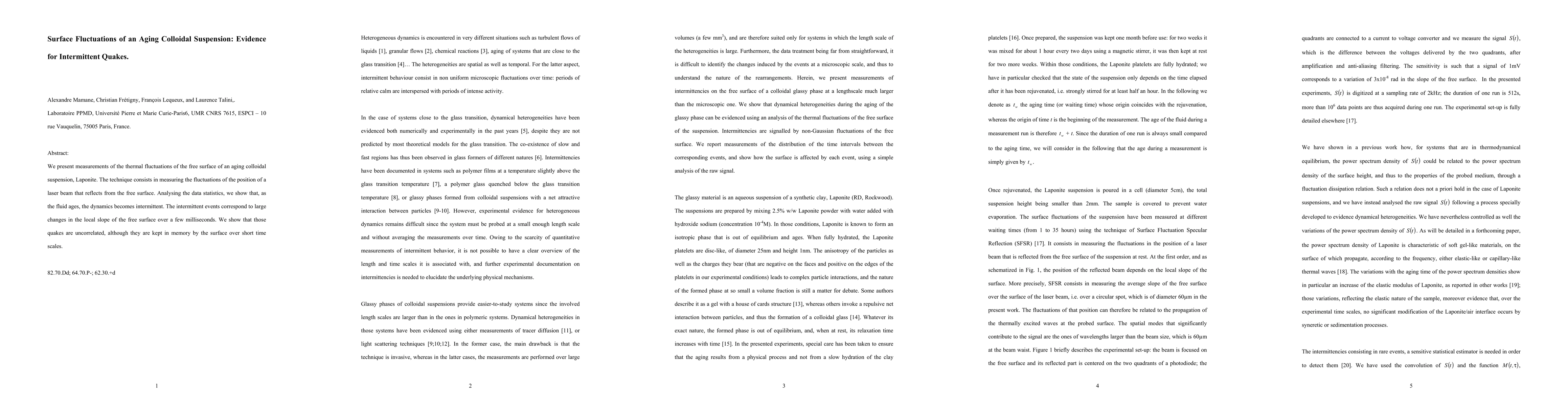 We present measurements of the thermal fluctuations of the free surface of an aging colloidal suspension, Laponite. The technique consists in measuring the fluctuations of the position of a laser beam that reflects from the free surface. Analysing the data statistics, we show that, as the fluid ages, the dynamics becomes intermittent. The intermittent events correspond to large changes in the local slope of the free surface over a few milliseconds. We show that those quakes are uncorrelated, although they are kept in memory by the surface over short time scales.
