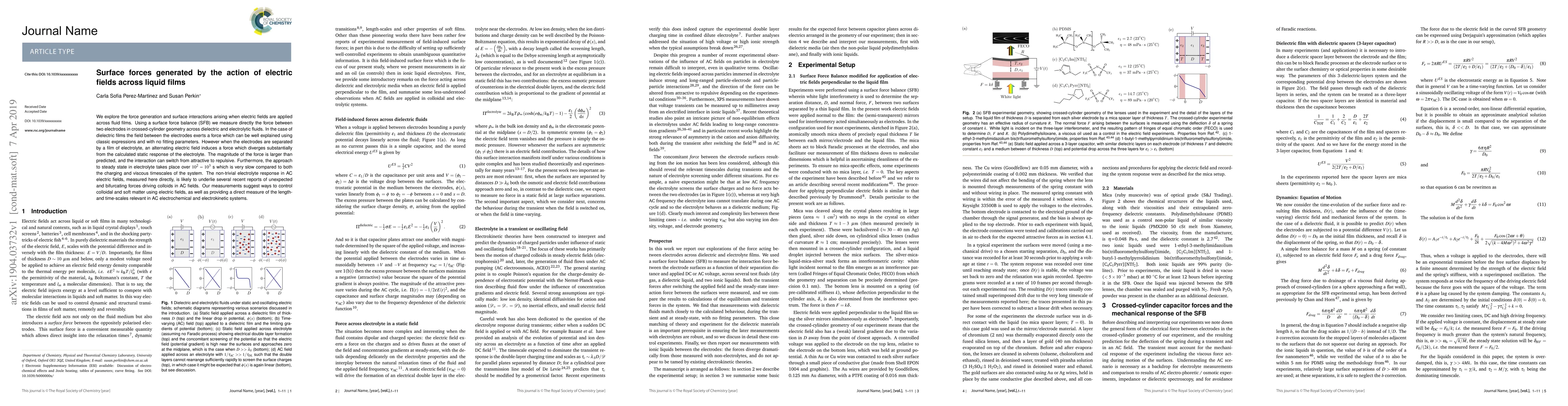 We explore the force generation and surface interactions arising when electric fields are applied across fluid films. Using a surface force balance (SFB) we measure directly the force between two electrodes in crossed-cylinder geometry across dielectric and electrolytic fluids. In the case of dielectric films the field between the electrodes exerts a force which can be well explained using classic expressions and with no fitting parameters. However when the electrodes are separated by a film of electrolyte, an alternating electric field induces a force which diverges substantially from the calculated static response of the electrolyte. The magnitude of the force is larger than predicted, and the interaction can switch from attractive to repulsive. Furthermore, the approach to steady state in electrolyte takes place over $10^2$ -- $10^3$~s which is very slow compared to both the charging and viscous timescales of the system. The non-trivial electrolyte response in AC electric fields, measured here directly, is likely to underlie several recent reports of unexpected and bifurcating forces driving colloids in AC fields. Our measurements suggest ways to control colloidal and soft matter using electric fields, as well as providing a direct measure of the length- and time-scales relevant in AC electrochemical and electrokinetic systems.