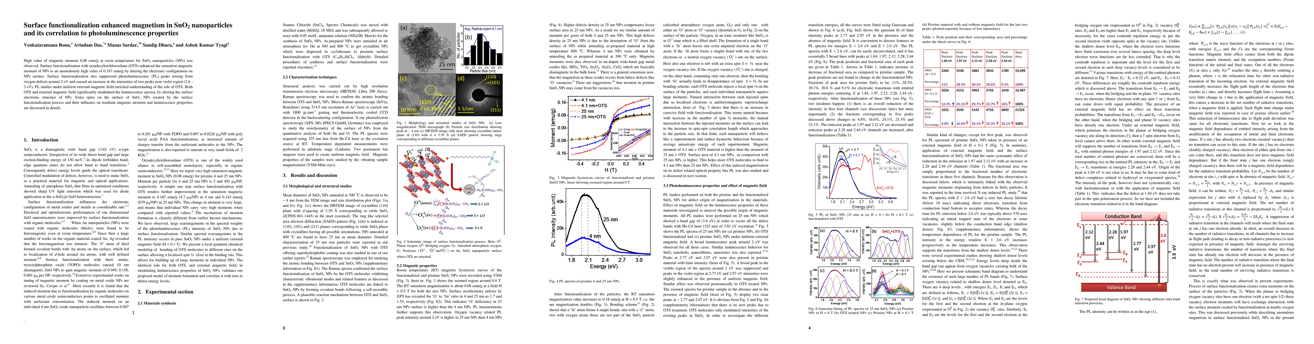 SnO_2 nanoparticles exhibit enhanced magnetic moment through surface functionalization with octadecyltrichlorosilane (OTS), increasing from 0.08 to 0.187 emu/g. This functionalization also modifies photoluminescence, suppressing defect-related peaks and enhancing violet region peaks, indicating changes in the surface electronic structure.