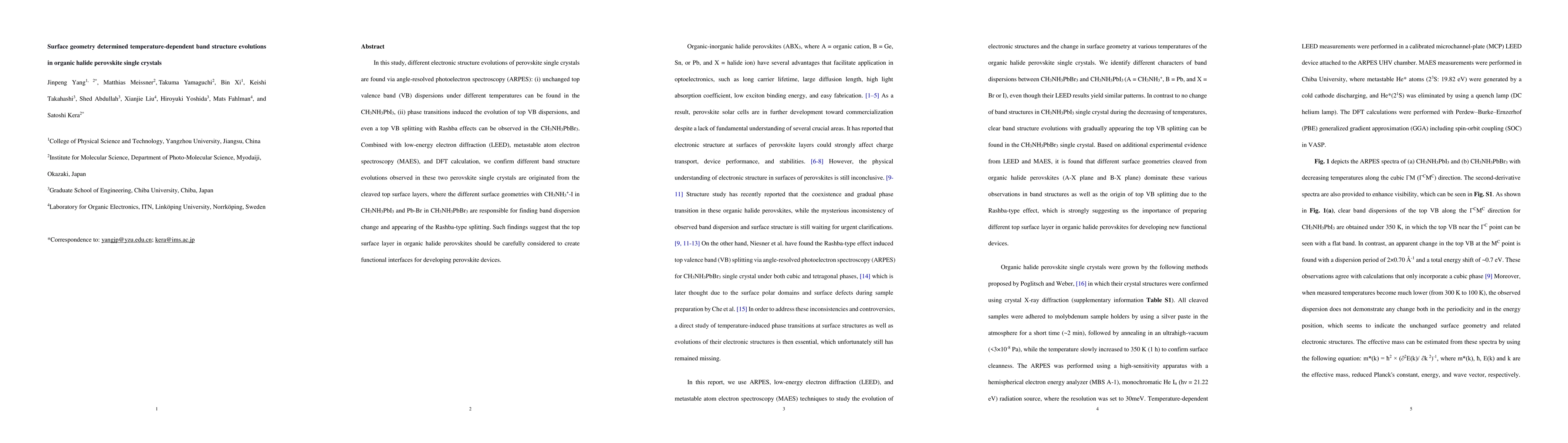 This study reveals temperature-dependent band structure evolutions in organic halide perovskite single crystals, showing unchanged top valence band dispersions in CH3NH3PbI3 and phase transition-induced changes in CH3NH3PbBr3, attributed to surface geometry differences. These findings highlight the importance of surface layers in perovskite device development.
