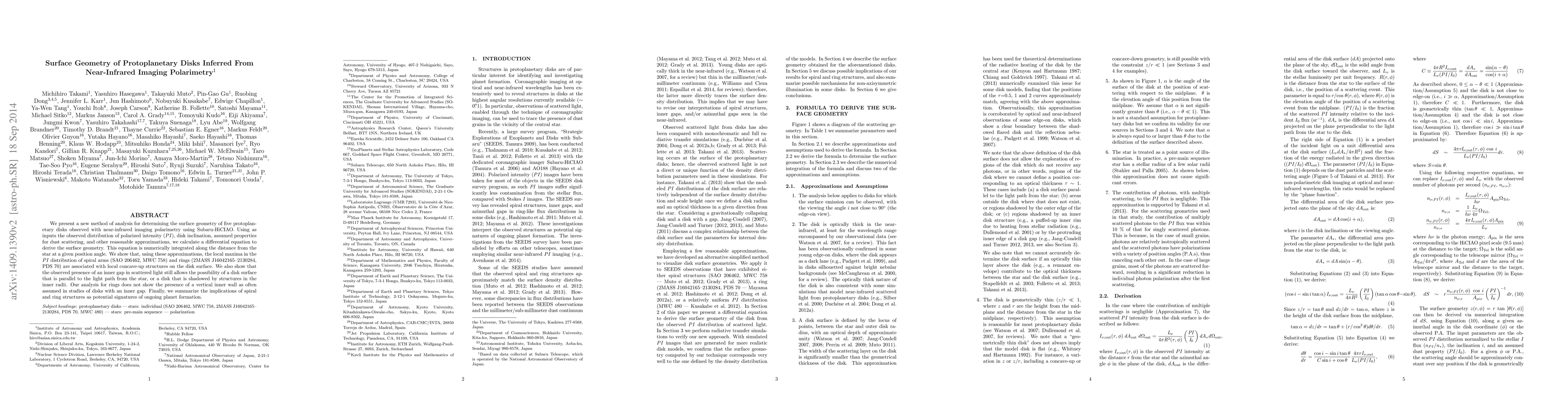 We present a new method of analysis for determining the surface geometry of five protoplanetary disks observed with near-infrared imaging polarimetry using Subaru-HiCIAO. Using as inputs the observed distribution of polarized intensity (PI), disk inclination, assumed properties for dust scattering, and other reasonable approximations, we calculate a differential equation to derive the surface geometry. This equation is numerically integrated along the distance from the star at a given position angle. We show that, using these approximations, the local maxima in the PI distribution of spiral arms (SAO 206462, MWC 758) and rings (2MASS J16042165-2130284, PDS 70) are associated with local concave-up structures on the disk surface. We also show that the observed presence of an inner gap in scattered light still allows the possibility of a disk surface that is parallel to the light path from the star, or a disk that is shadowed by structures in the inner radii. Our analysis for rings does not show the presence of a vertical inner wall as often assumed in studies of disks with an inner gap. Finally, we summarize the implications of spiral and ring structures as potential signatures of ongoing planet formation.