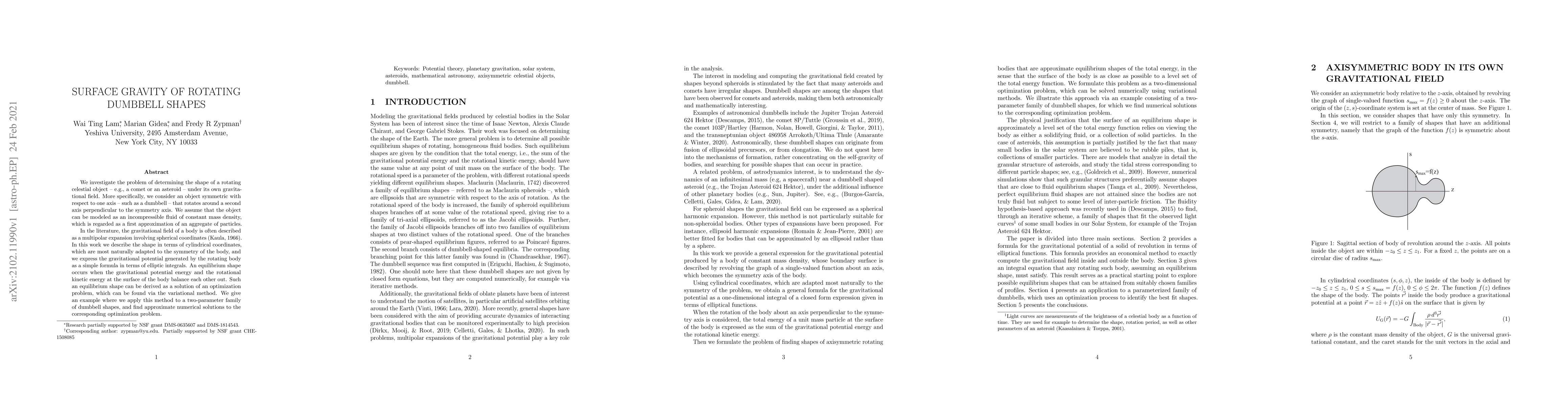 We investigate the problem of determining the shape of a rotating celestial object - e.g., a comet or an asteroid - under its own gravitational field. More specifically, we consider an object symmetric with respect to one axis - such as a dumbbell - that rotates around a second axis perpendicular to the symmetry axis. We assume that the object can be modeled as an incompressible fluid of constant mass density, which is regarded as a first approximation of an aggregate of particles. In the literature, the gravitational field of a body is often described as a multipolar expansion involving spherical coordinates (Kaula, 1966). In this work we describe the shape in terms of cylindrical coordinates, which are most naturally adapted to the symmetry of the body, and we express the gravitational potential generated by the rotating body as a simple formula in terms of elliptic integrals. An equilibrium shape occurs when the gravitational potential energy and the rotational kinetic energy at the surface of the body balance each other out. Such an equilibrium shape can be derived as a solution of an optimization problem, which can be found via the variational method. We give an example where we apply this method to a two-parameter family of dumbbell shapes, and find approximate numerical solutions to the corresponding optimization problem.