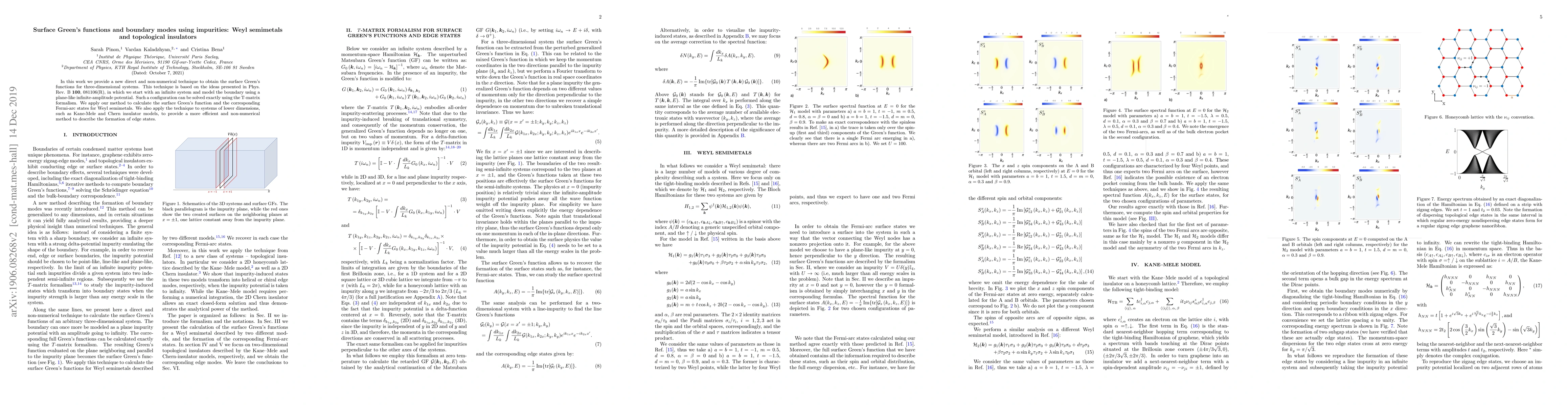 This paper introduces a non-numerical method to calculate surface Green's functions for three-dimensional Weyl semimetals and topological insulators using impurities modeled by infinite-amplitude potentials. The technique is applied to derive Fermi-arc states and edge states in lower-dimensional systems like Kane-Mele and Chern insulators.