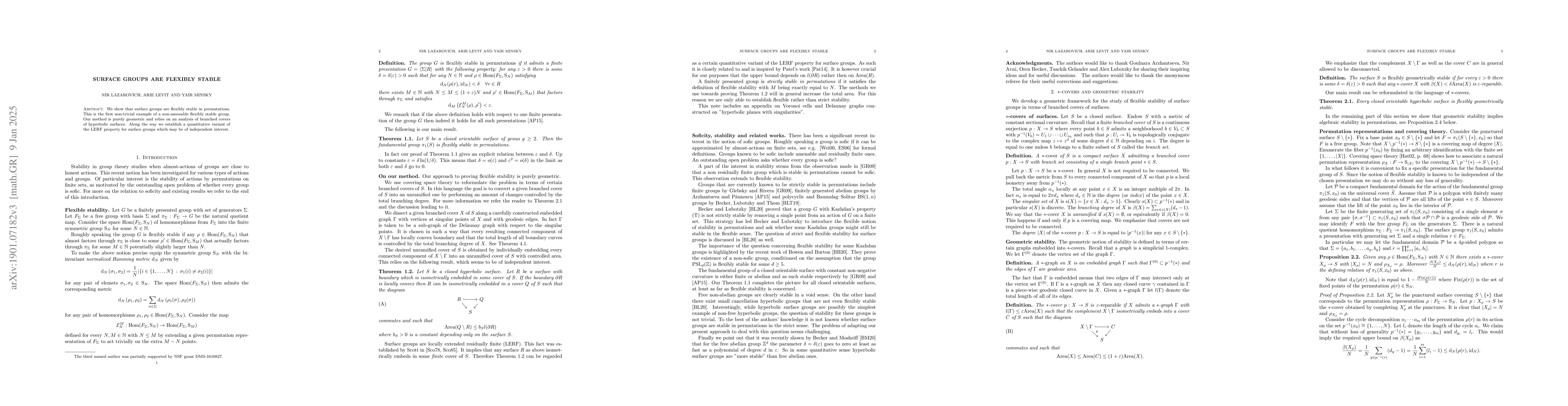 We show that surface groups are flexibly stable in permutations. Our method is purely geometric and relies on an analysis of branched covers of hyperbolic surfaces. Along the way we establish a quantitative variant of the LERF property for surface groups which may be of independent interest.