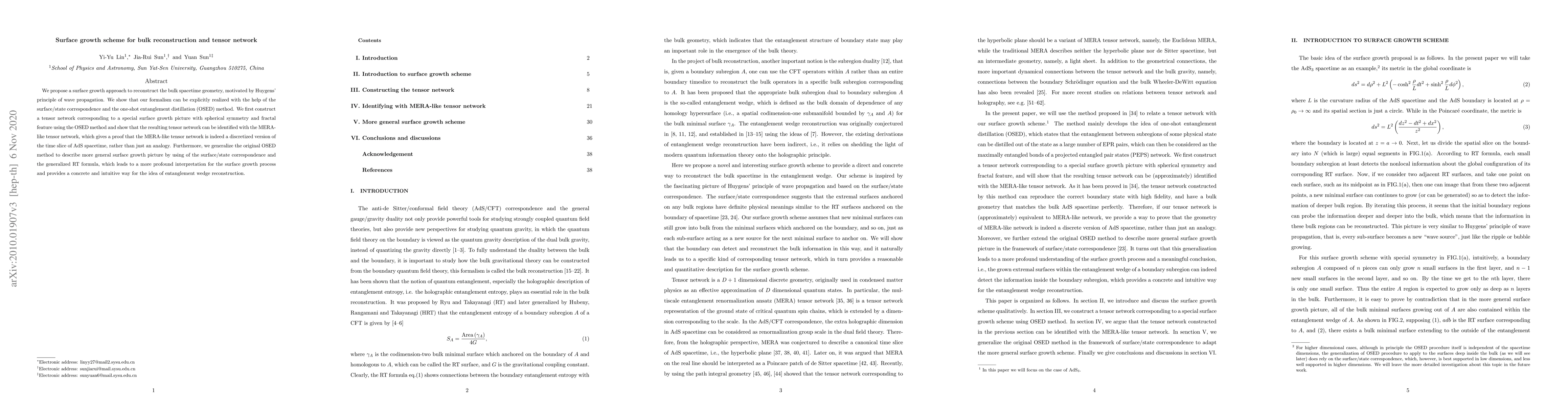 This paper proposes a surface growth scheme to reconstruct bulk spacetime using tensor networks, showing equivalence to MERA-like networks and proving they represent discretized AdS spacetime slices. It further generalizes the method to better understand surface growth and entanglement wedge reconstruction.