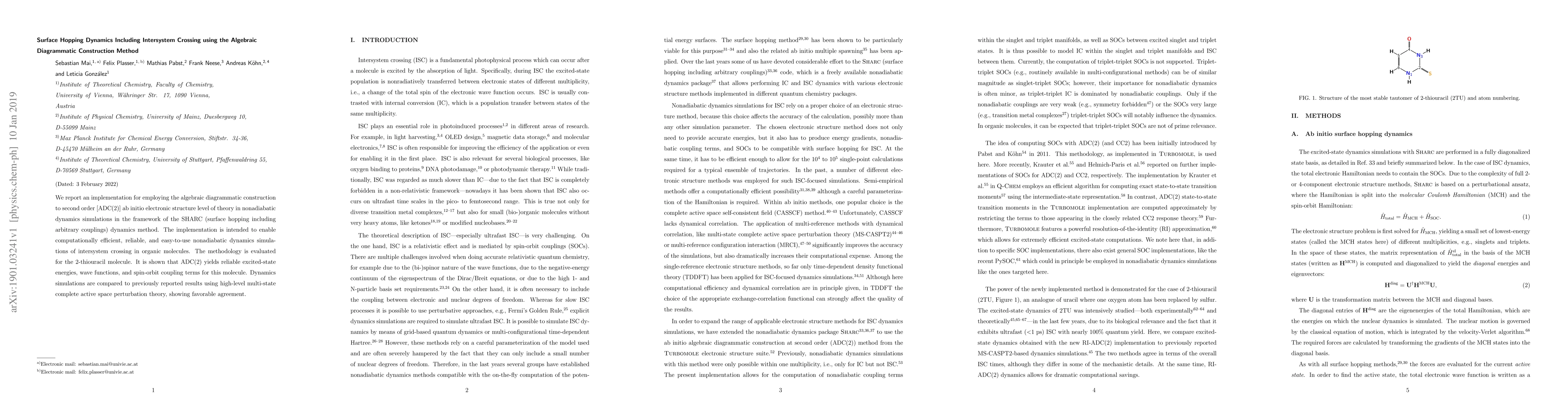 We report an implementation for employing the algebraic diagrammatic construction to second order [ADC(2)] ab initio electronic structure level of theory in nonadiabatic dynamics simulations in the framework of the SHARC (surface hopping including arbitrary couplings) dynamics method. The implementation is intended to enable computationally efficient, reliable, and easy-to-use nonadiabatic dynamics simulations of intersystem crossing in organic molecules. The methodology is evaluated for the 2-thiouracil molecule. It is shown that ADC(2) yields reliable excited-state energies, wave functions, and spin-orbit coupling terms for this molecule. Dynamics simulations are compared to previously reported results using high-level multi-state complete active space perturbation theory, showing favorable agreement.