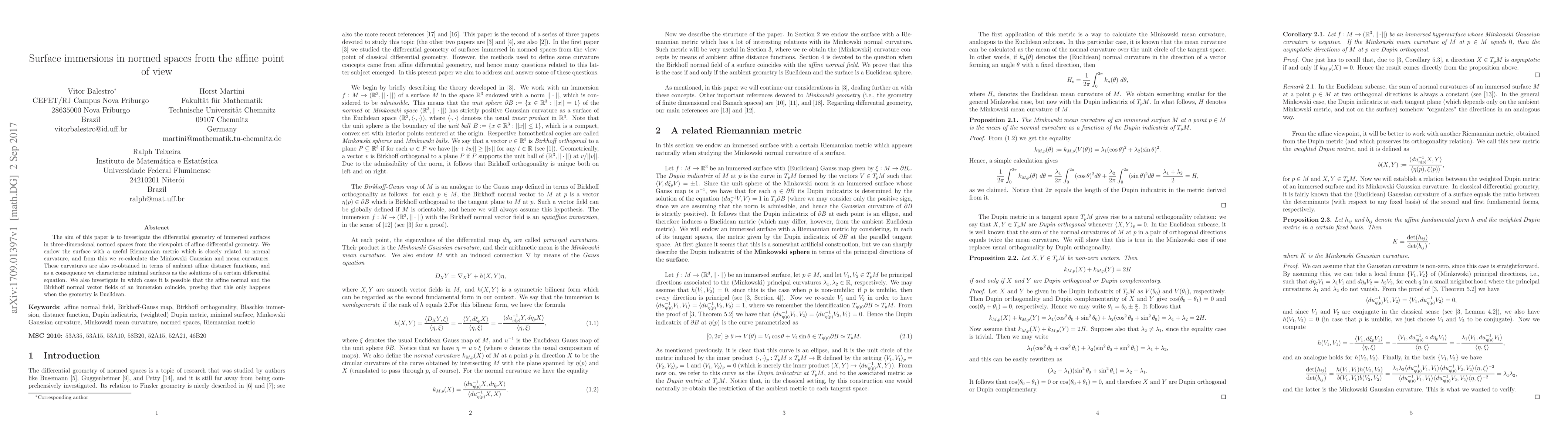 The aim of this paper is to investigate the differential geometry of immersed surfaces in three-dimensional normed spaces from the viewpoint of affine differential geometry. We endow the surface with a useful Riemannian metric which is closely related to normal curvature, and from this we re-calculate the Minkowski Gaussian and mean curvatures. These curvatures are also re-obtained in terms of ambient affine distance functions, and as a consequence we characterize minimal surfaces as the solutions of a certain differential equation. We also investigate in which cases it is possible that the affine normal and the Birkhoff normal vector fields of an immersion coincide, proving that this only happens when the geometry is Euclidean.