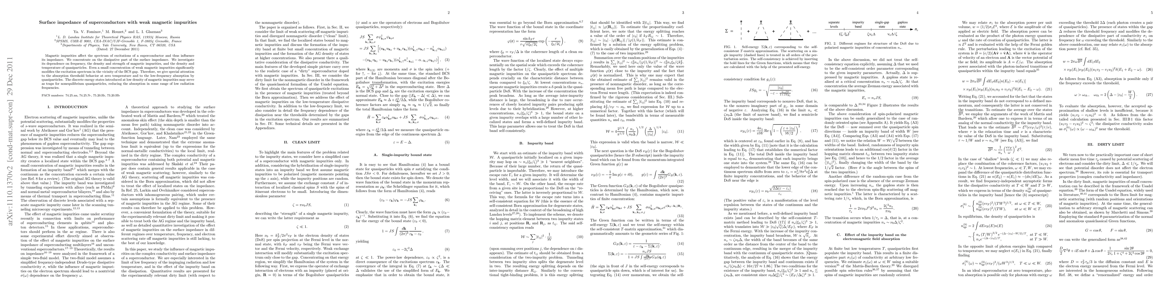 Research on superconductors with weak magnetic impurities shows that even small concentrations can significantly modify their excitation spectrum, affecting surface impedance at low frequencies. This discovery highlights the impact of magnetic impurities on quasiparticle behavior and potential absorption threshold shifts.