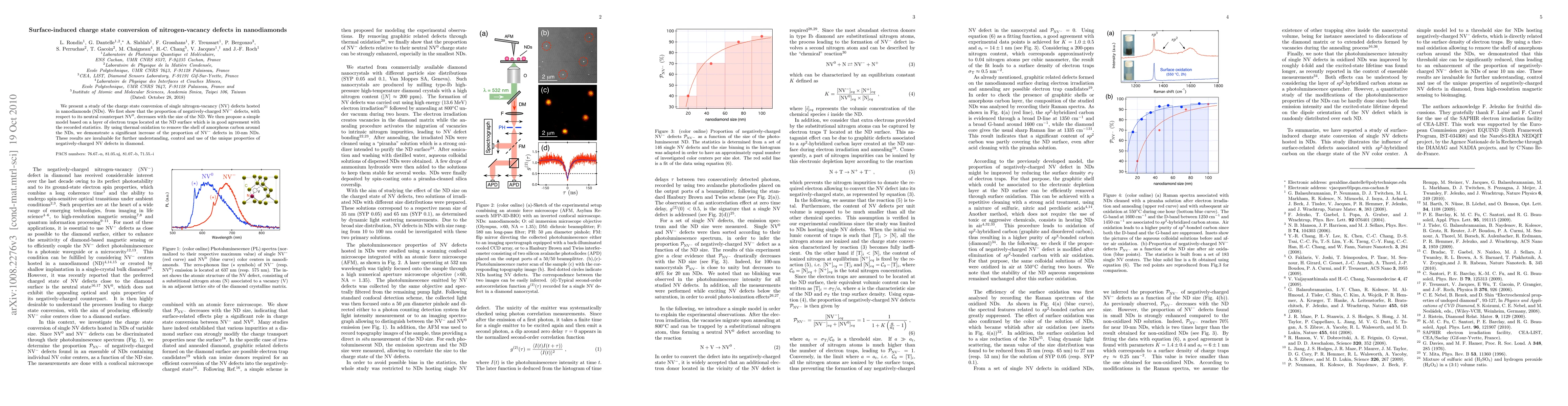 This study investigates the charge state conversion of nitrogen-vacancy (NV) defects in nanodiamonds, revealing a decrease in negatively-charged NV$^{-}$ defects with larger diamond size. A proposed model attributes this to electron traps at the ND surface, which is validated by experiments showing increased NV$^{-}$ proportion after thermal oxidation.