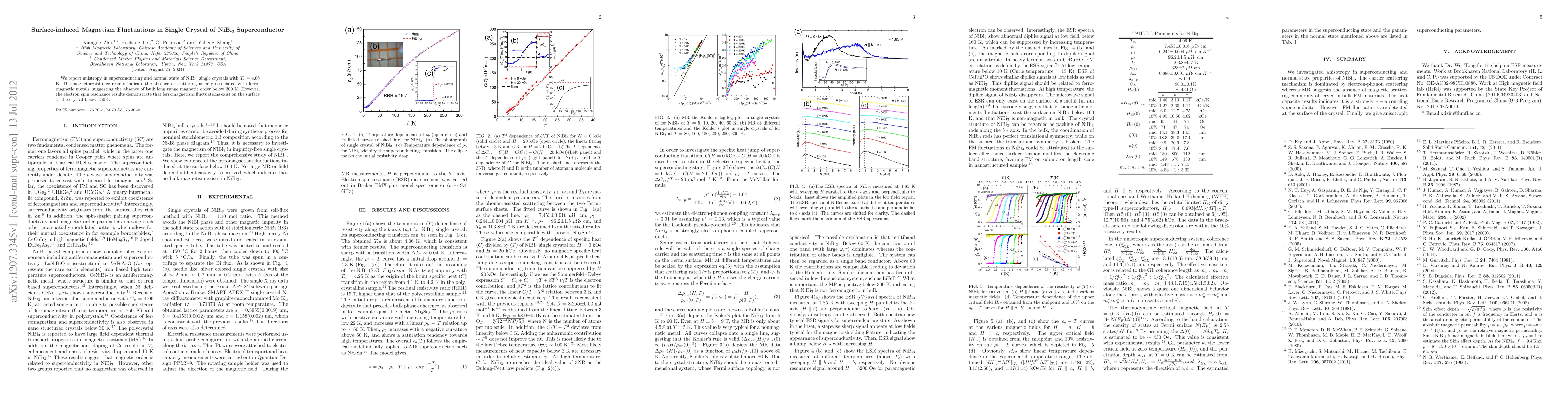 This paper investigates NiBi3 single crystals, revealing anisotropy in both superconducting and normal states with a critical temperature of 4.06 K. While bulk magnetic order is absent below 300 K, electron spin resonance shows surface ferromagnetism fluctuations below 150 K.