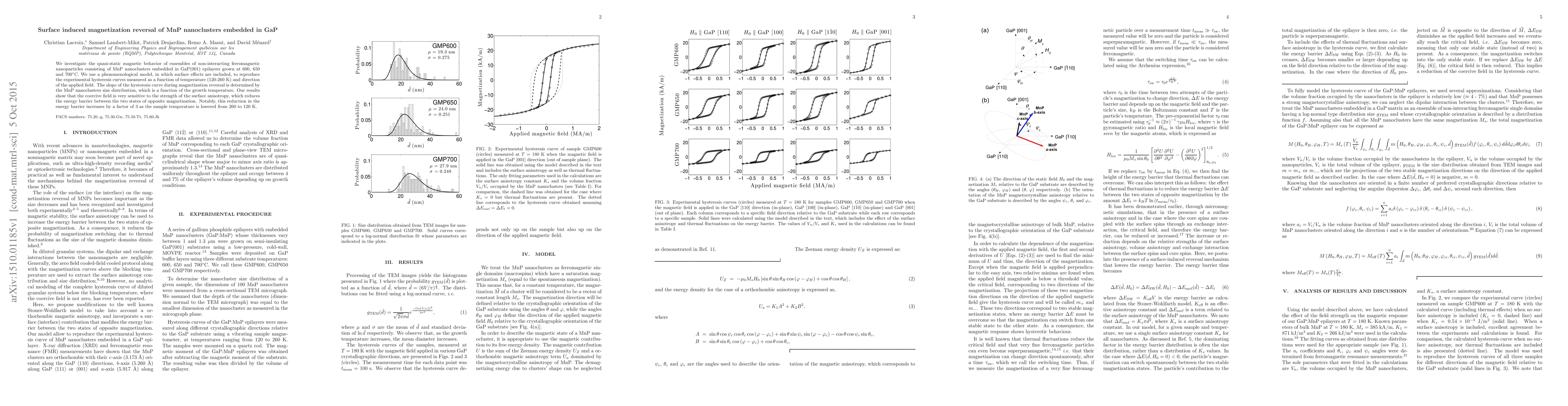 This study explores the quasi-static magnetic behavior of MnP nanoclusters embedded in GaP, revealing that surface anisotropy significantly influences the coercive field and energy barrier for magnetization reversal. The size distribution of MnP nanoclusters, affected by growth temperature, determines the slope of the hysteresis curve, with a notable threefold increase in the reduction of energy barrier as temperature decreases.